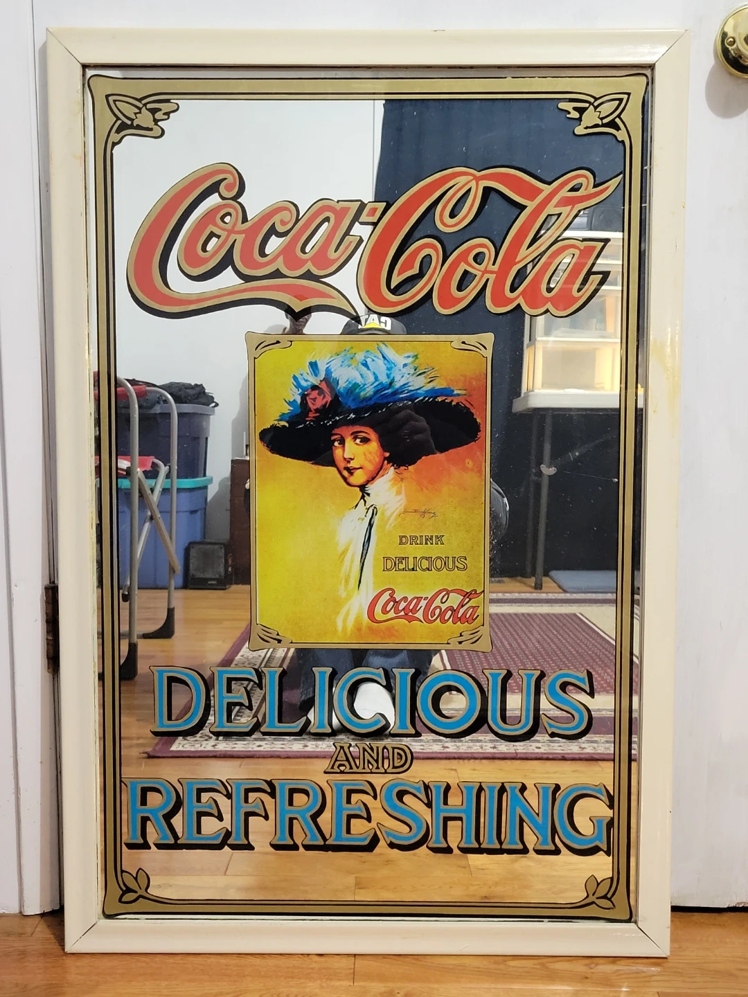 Decorative Coca-Cola mirror featuring vintage artwork. It reads "Delicious and Refreshing" with the iconic Coca-Cola logo. This piece is perfect for a collector or fan.