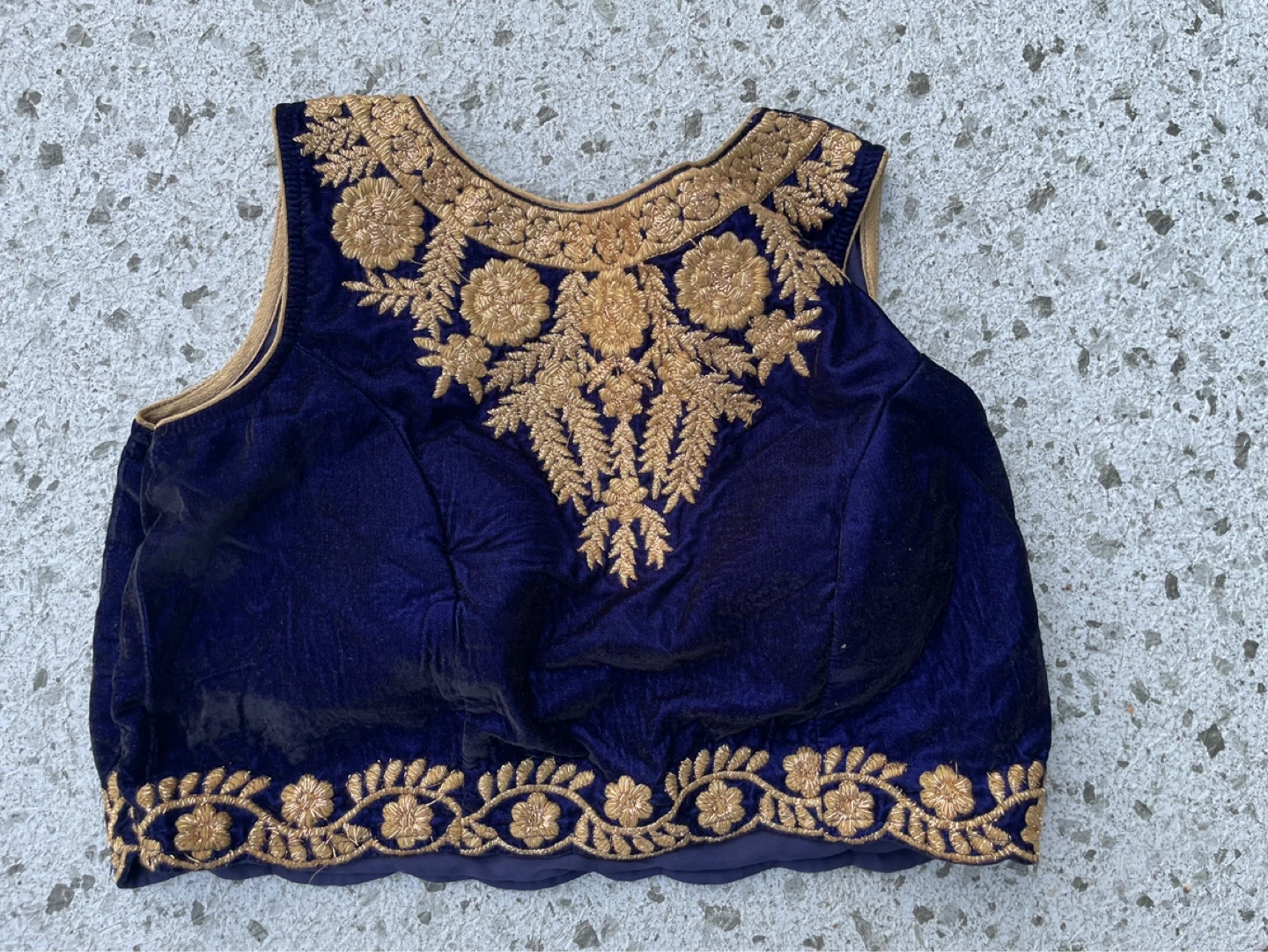 Beautiful navy blue velvet blouse. Features intricate gold embroidery on the neckline and hem. Sleeveless design with a keyhole closure at the back. Perfect for special occasions!