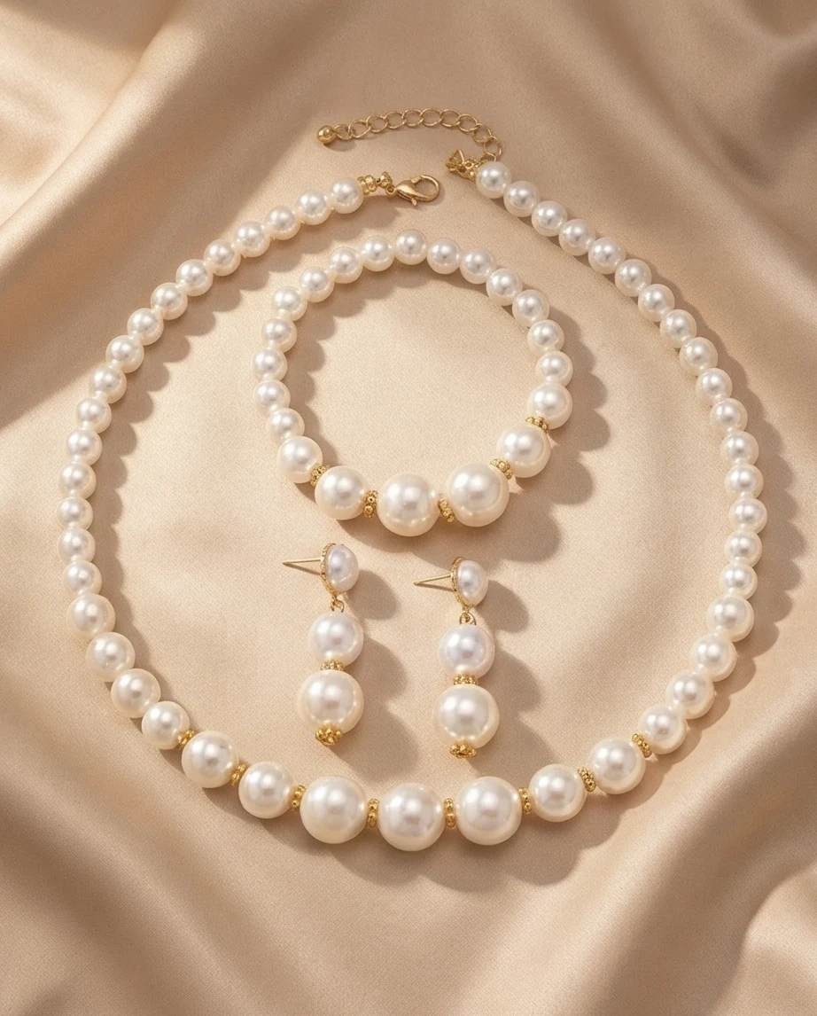 This is a three-piece pearl jewellery set, including a necklace, a bracelet, and a pair of dangle earrings. It features faux pearls with gold-tone accents.This set adds a classic touch to any outfit.