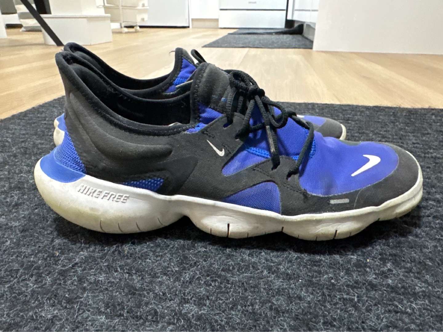 These Nike Free RN 5.0 running shoes are blue and black with a white sole. They feature a lace-up closure for a secure fit. They're designed for running and training activities.