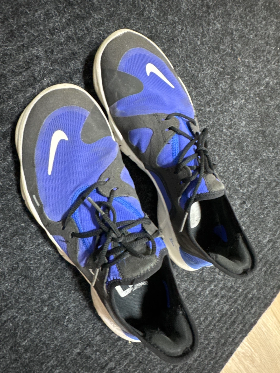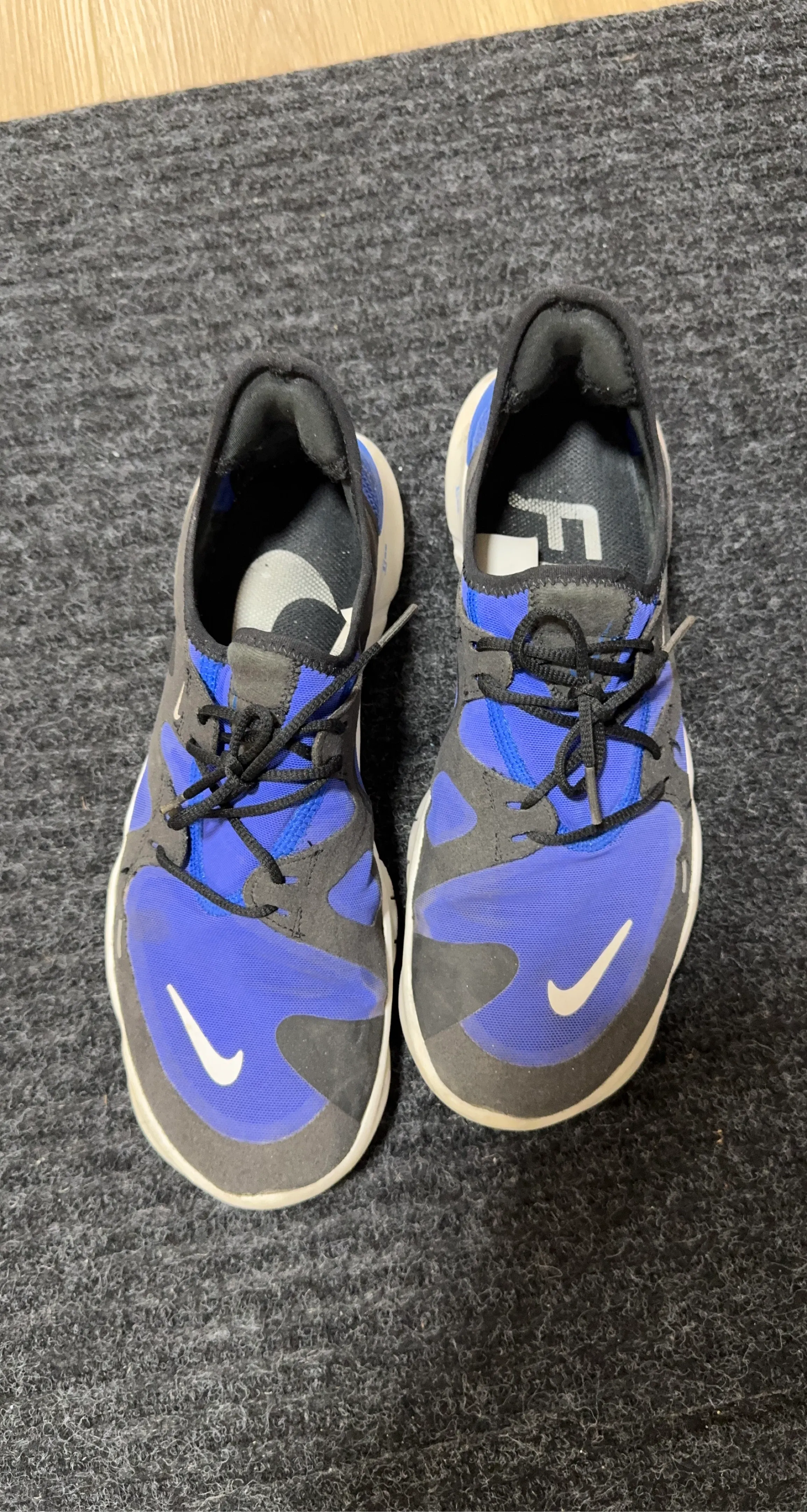 These Nike Free RN 5.0 running shoes are blue and black with a white sole. They feature a lace-up closure for a secure fit. They're designed for running and training activities.