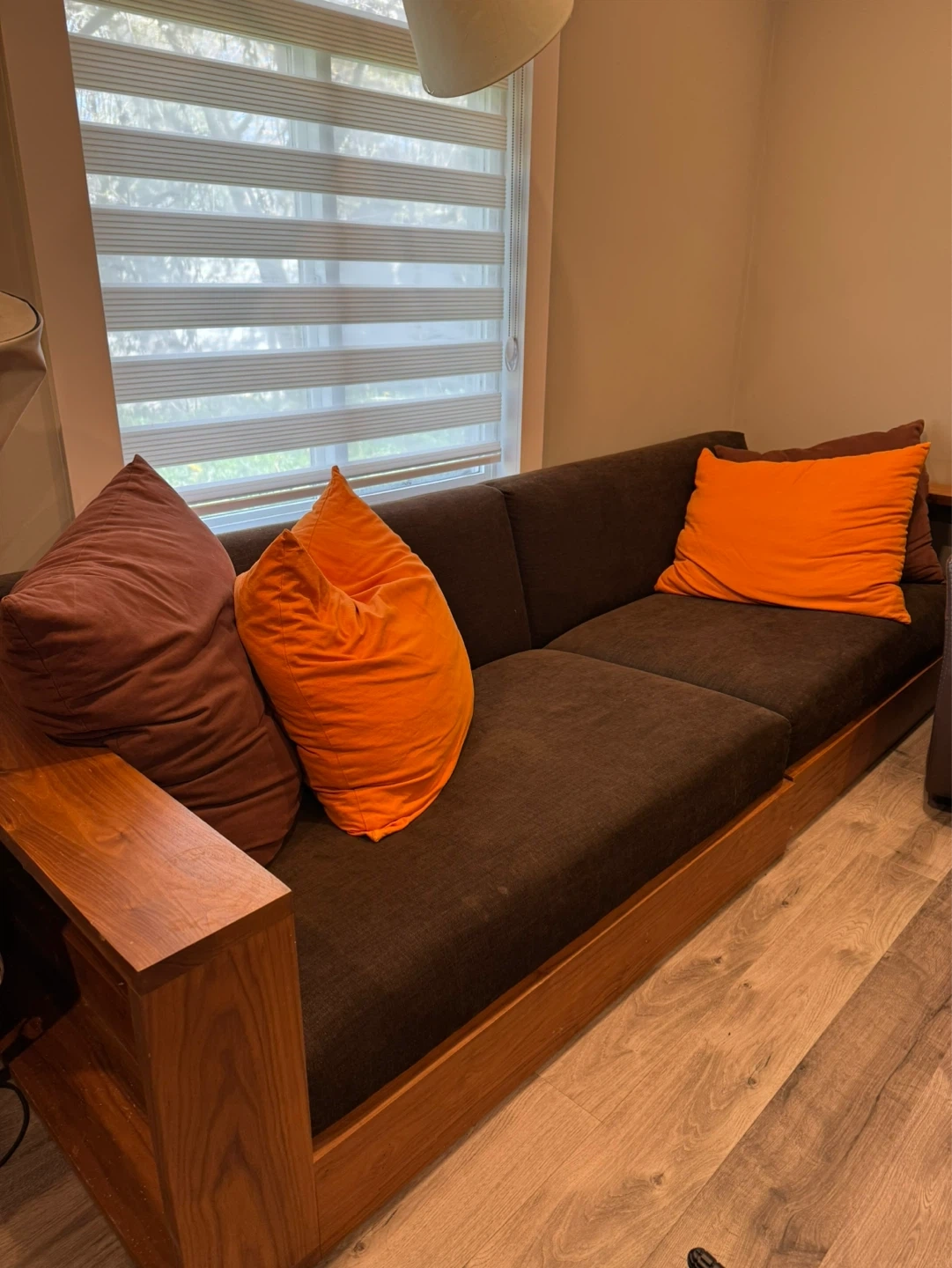 This is a comfortable brown sofa with a solid wood frame. It's upholstered in a durable fabric. The wooden arms offer a nice contrast and support. It's a sturdy piece of furniture perfect for a living room.