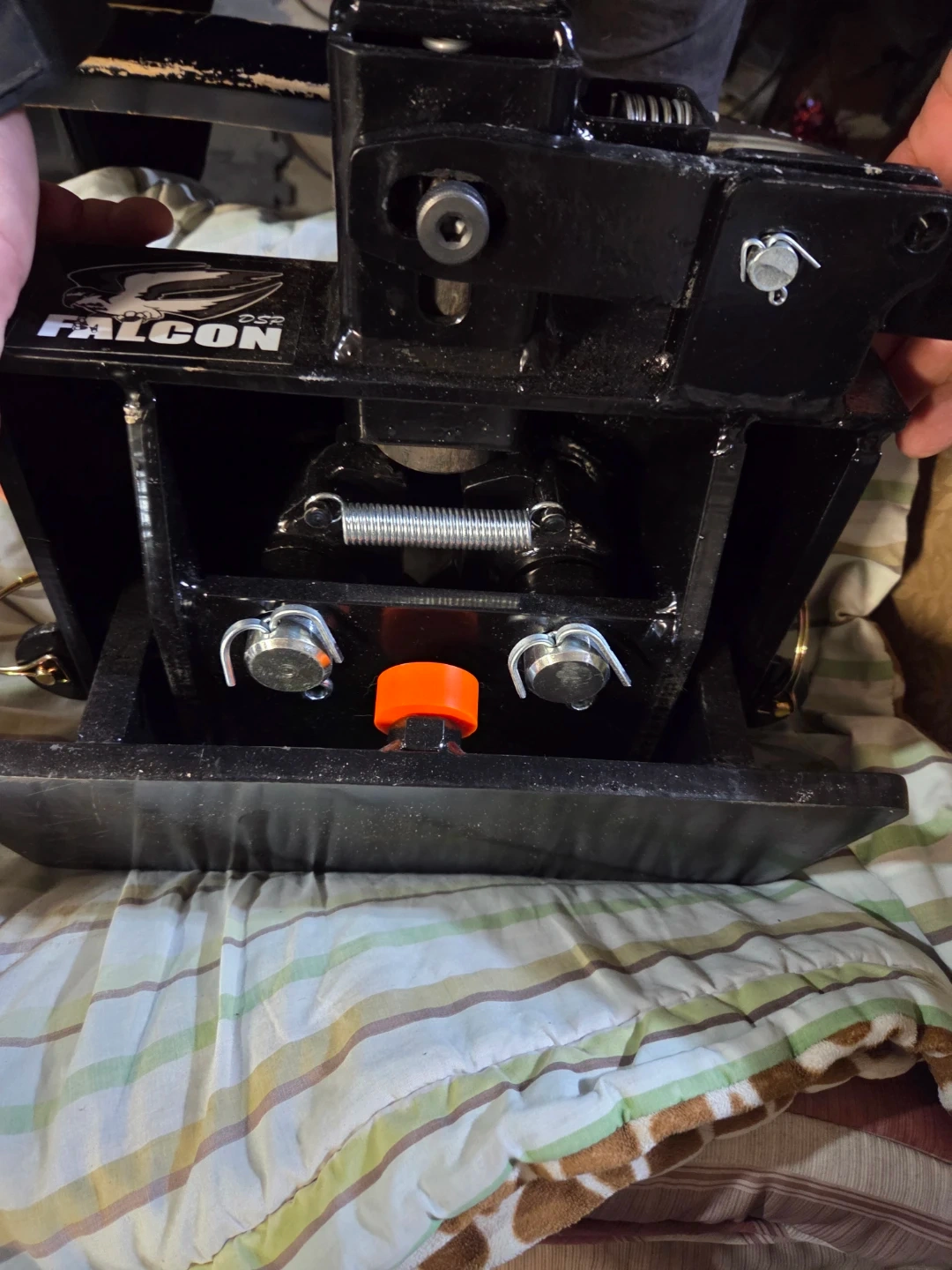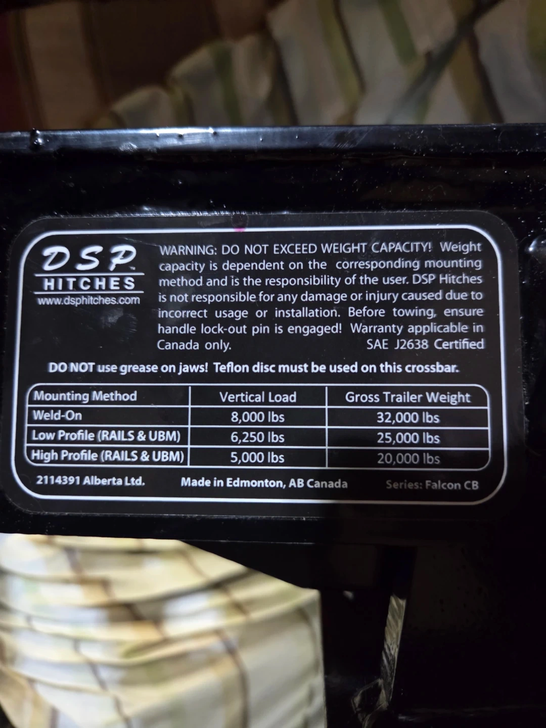 This is a Falcon CB fifth wheel trailer hitch from DSP Hitches. It's made in Edmonton, Alberta, Canada. The hitch is designed for towing trailers, with different weight capacities depending on the mounting method. It's SAE J2638 Certified.