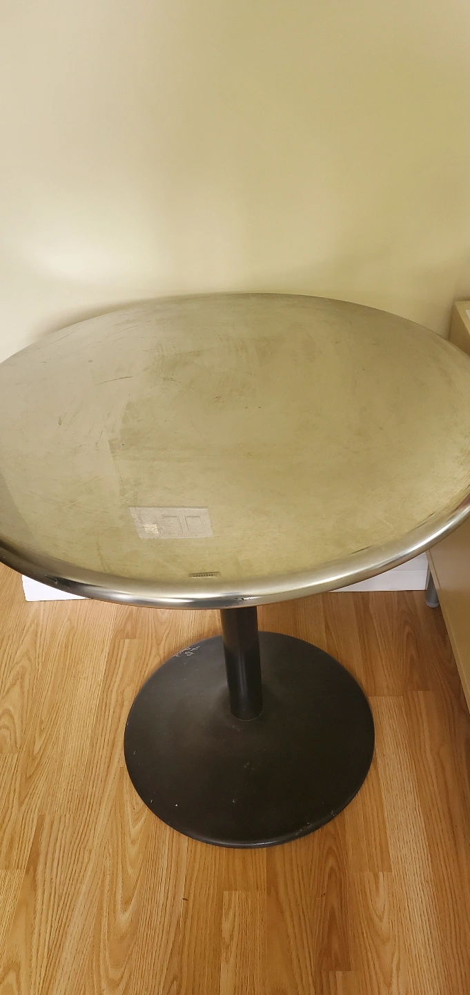Small round table. Metal top and black pedestal base. This is in good condition. Its a little wobbly because the screw need storage be tighten. 28" in diameter and 27.5" high