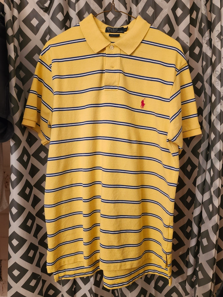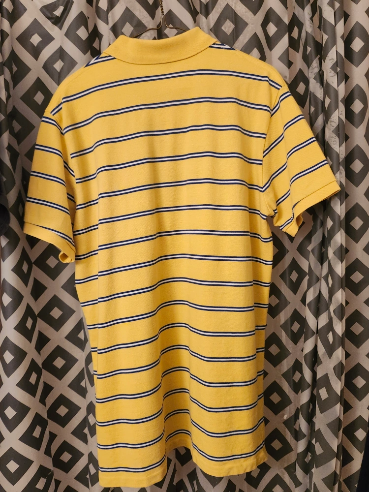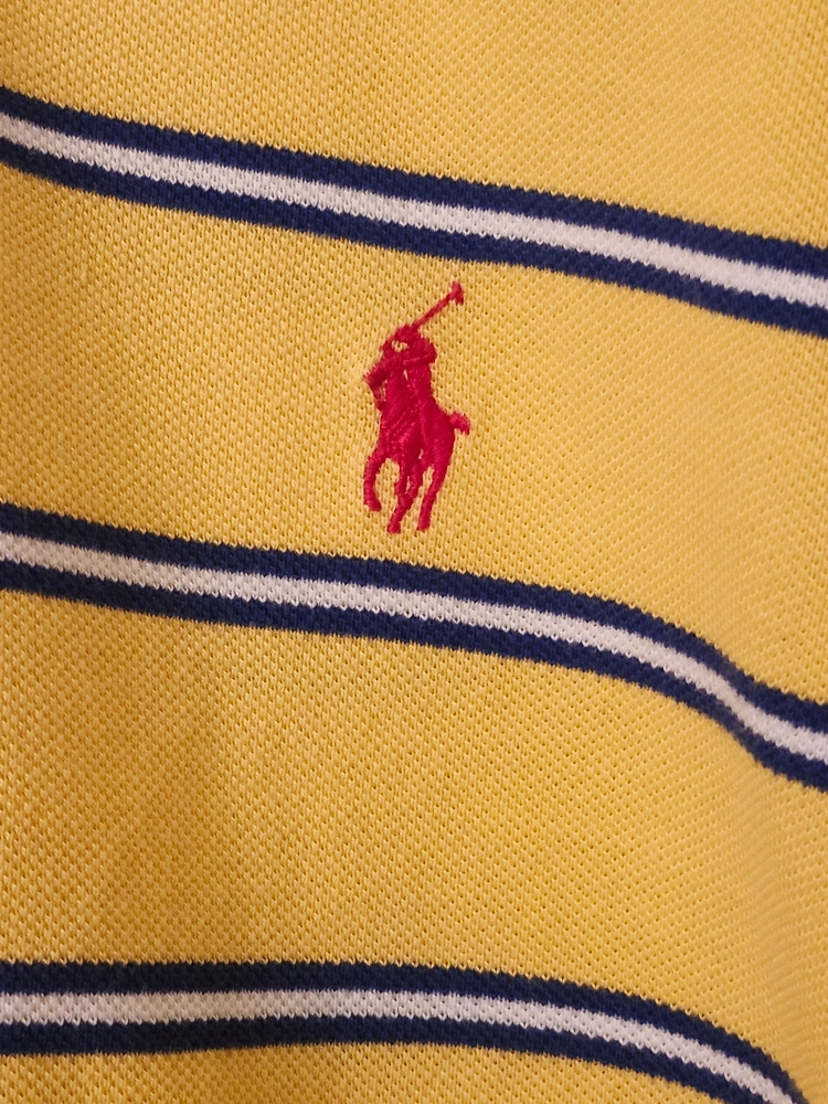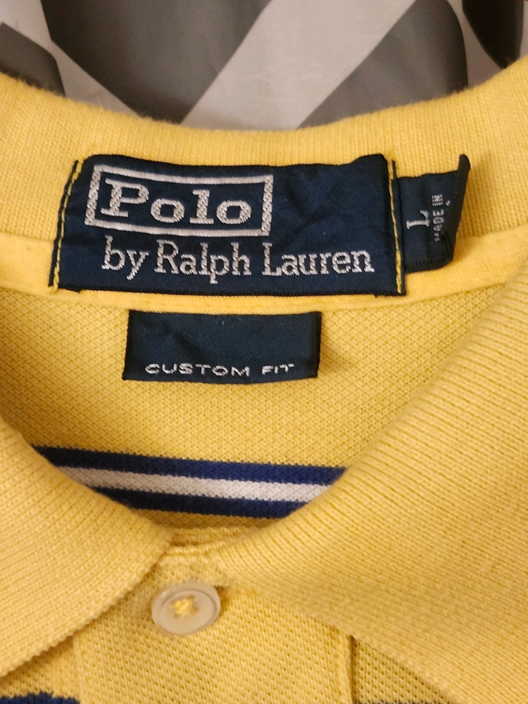 Men's Polo Ralph Lauren custom fit polo shirt. Yellow with navy blue stripes. Size Large. Short sleeves. Classic style.