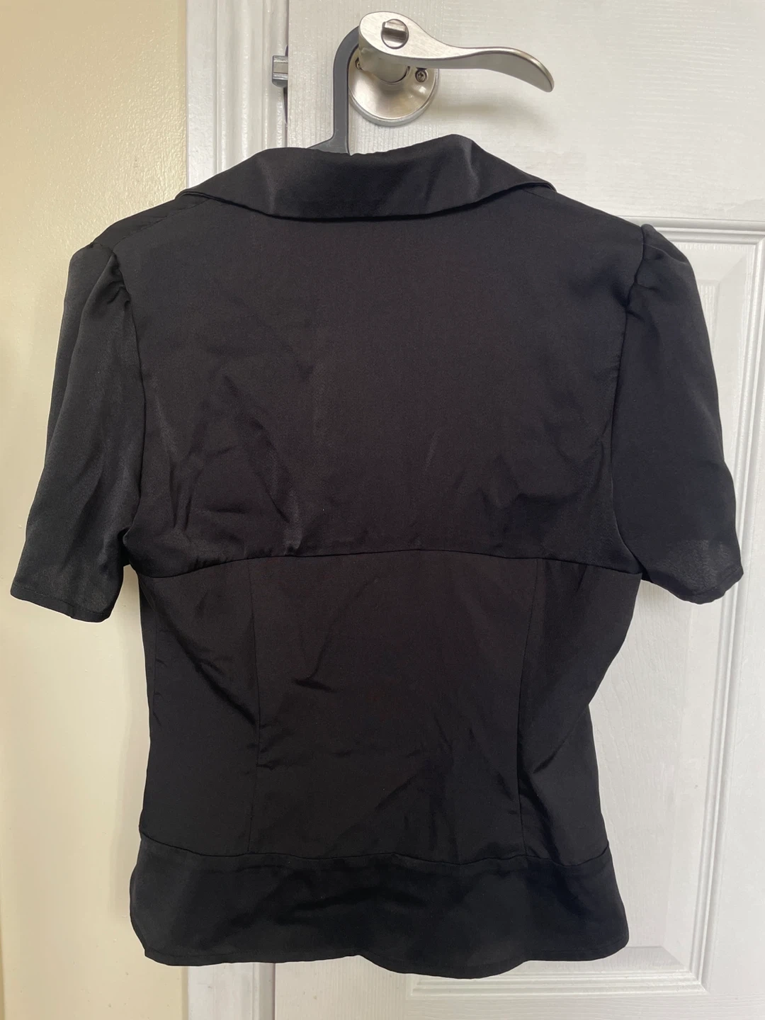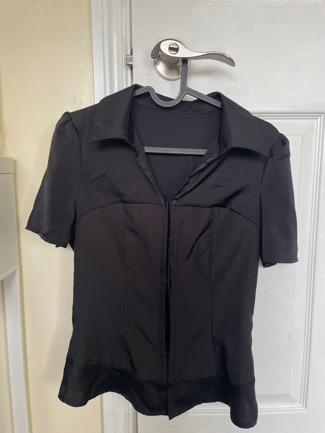 This black top has a corset-style closure with hook and eye fastenings. It features short, puffed sleeves and a collared neckline. Material appears to be a satin-like fabric.