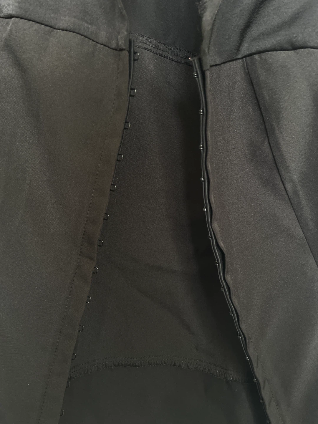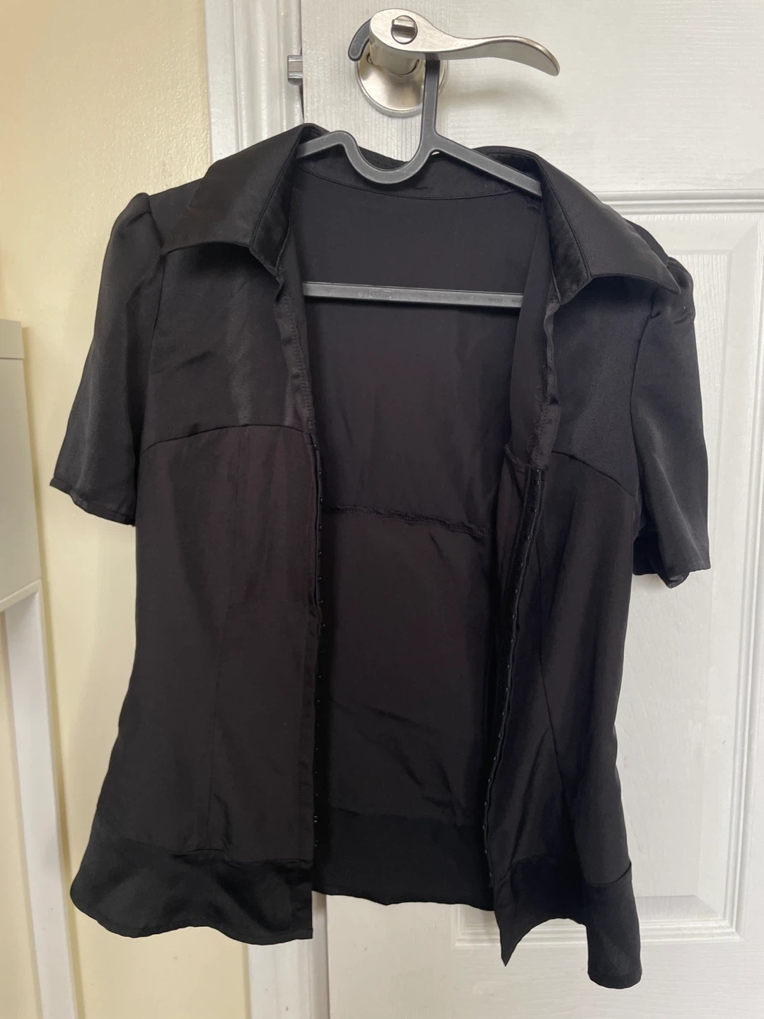 This black top has a corset-style closure with hook and eye fastenings. It features short, puffed sleeves and a collared neckline. Material appears to be a satin-like fabric.