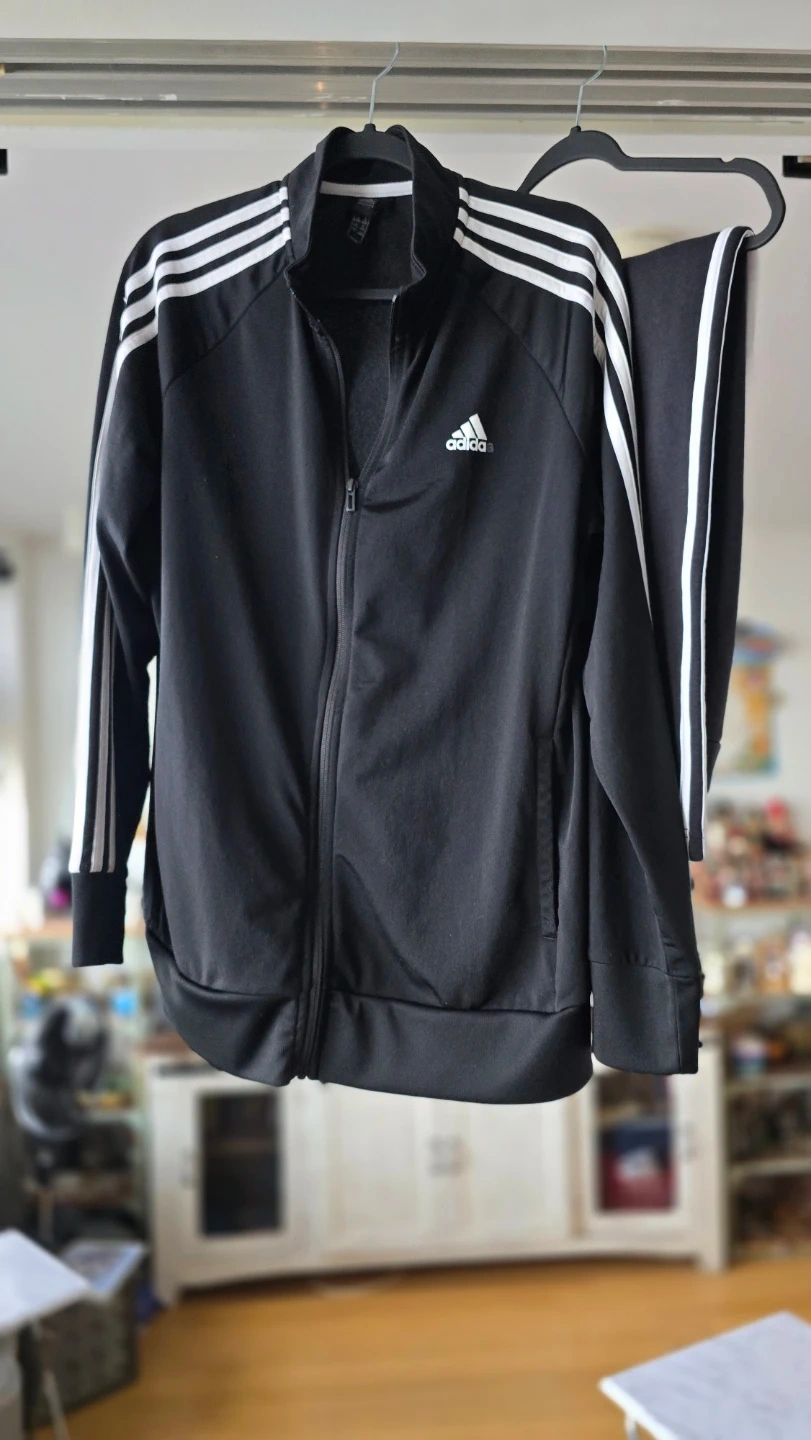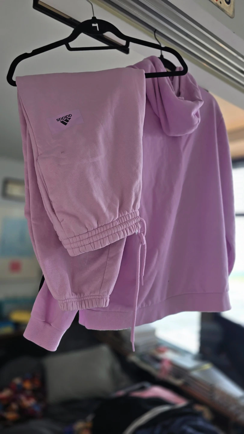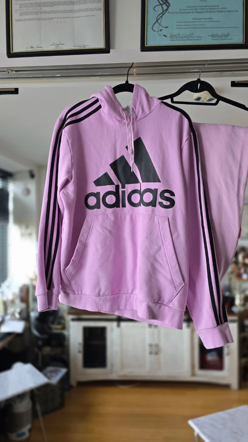 This is an Adidas pink hoodie with black stripes on the sleeves and a large black Adidas logo on the front. It's a pullover style with a drawstring hood and a front pocket. Matching pink Adidas pants are included. Both pieces are made of soft, comfortable fabric.