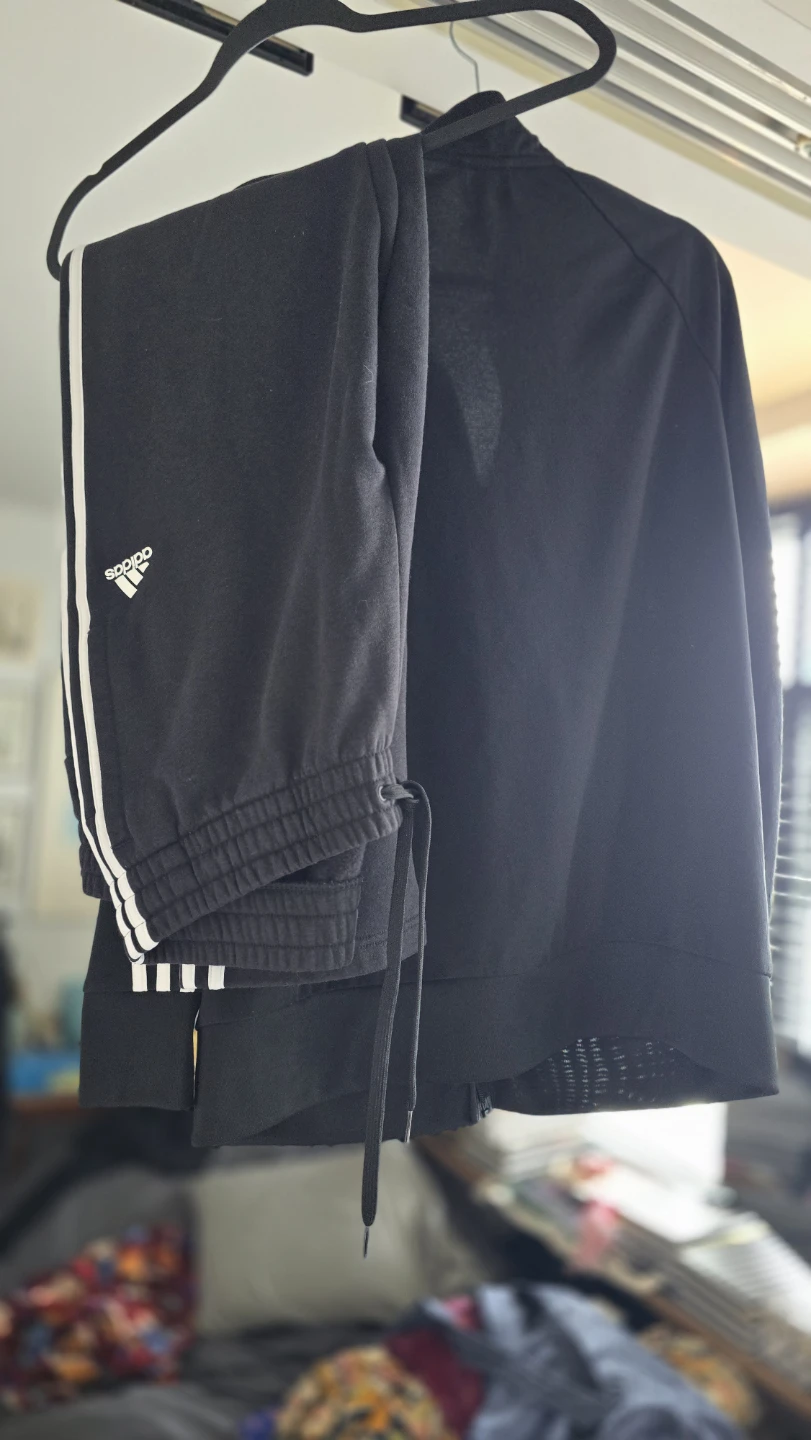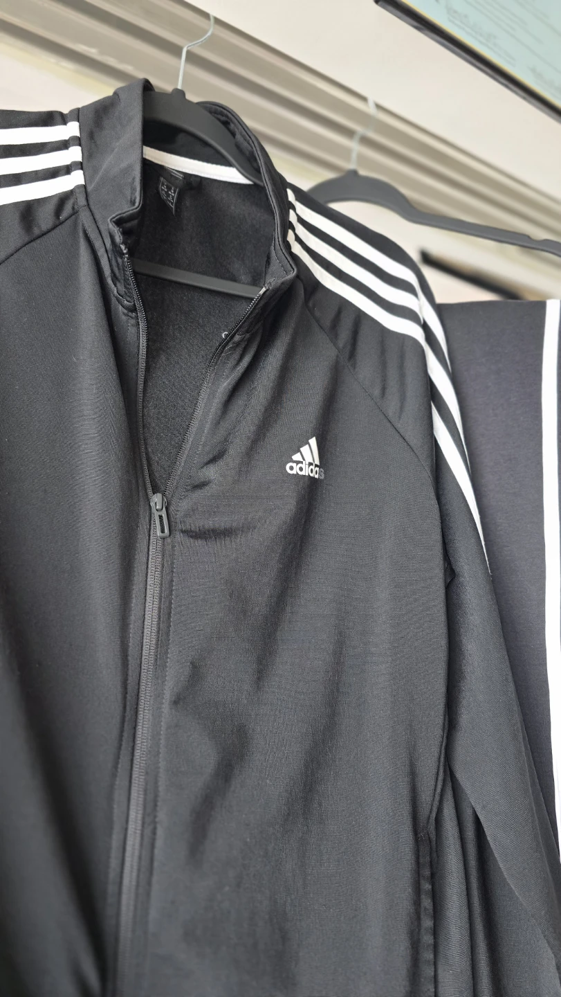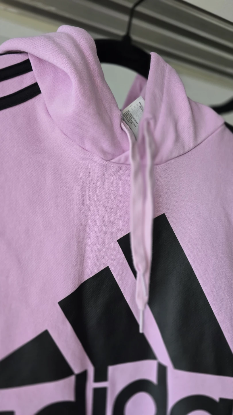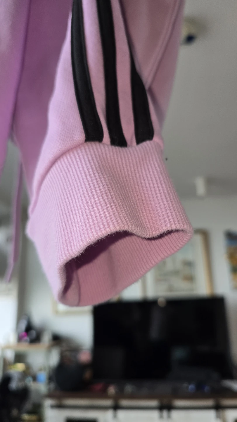 This is an Adidas pink hoodie with black stripes on the sleeves and a large black Adidas logo on the front. It's a pullover style with a drawstring hood and a front pocket. Matching pink Adidas pants are included. Both pieces are made of soft, comfortable fabric.