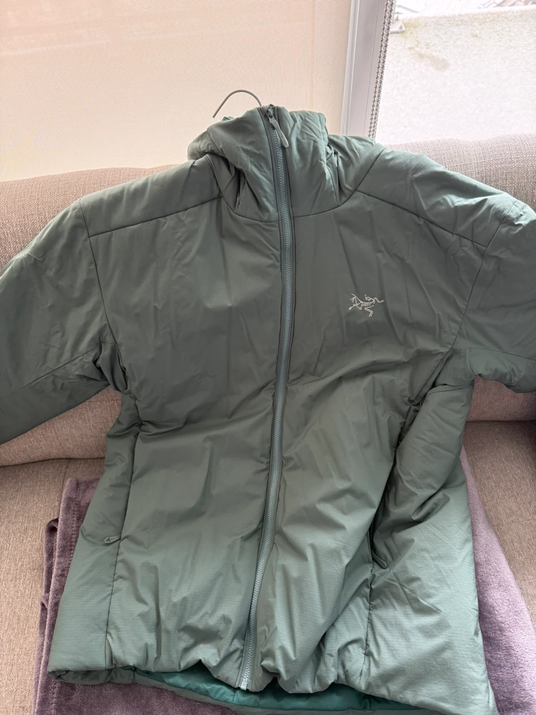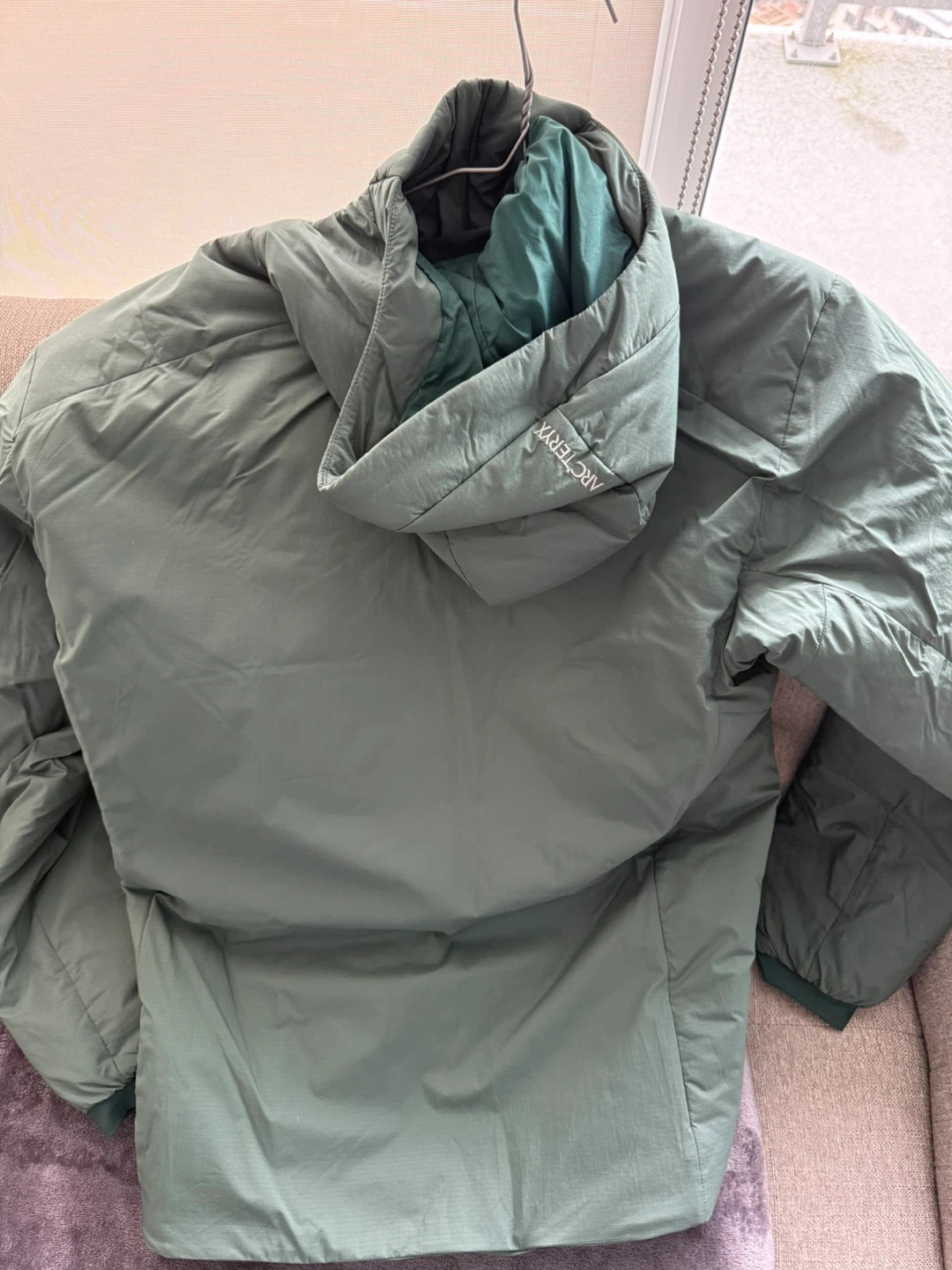 Arc'teryx hooded puffer jacket in a muted green colour. It's a size large. This jacket is lightweight and insulated.