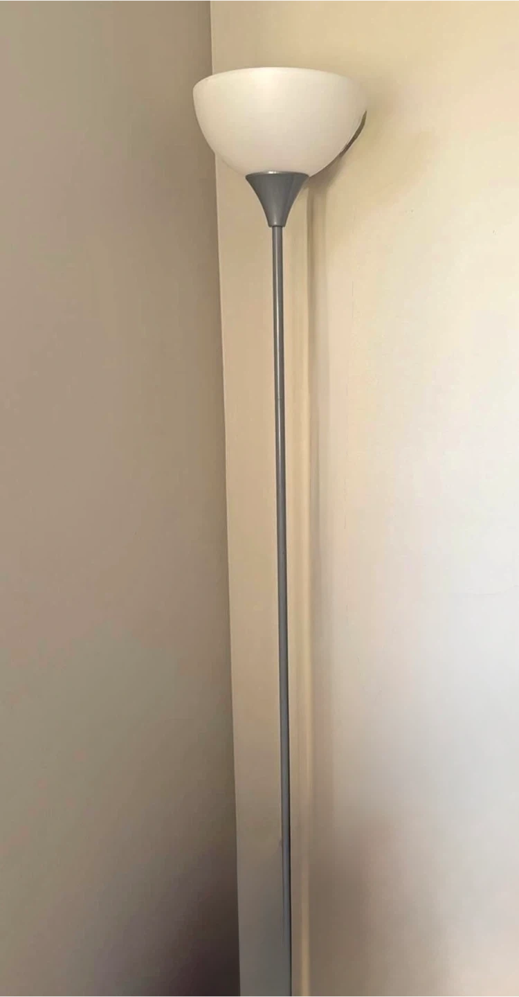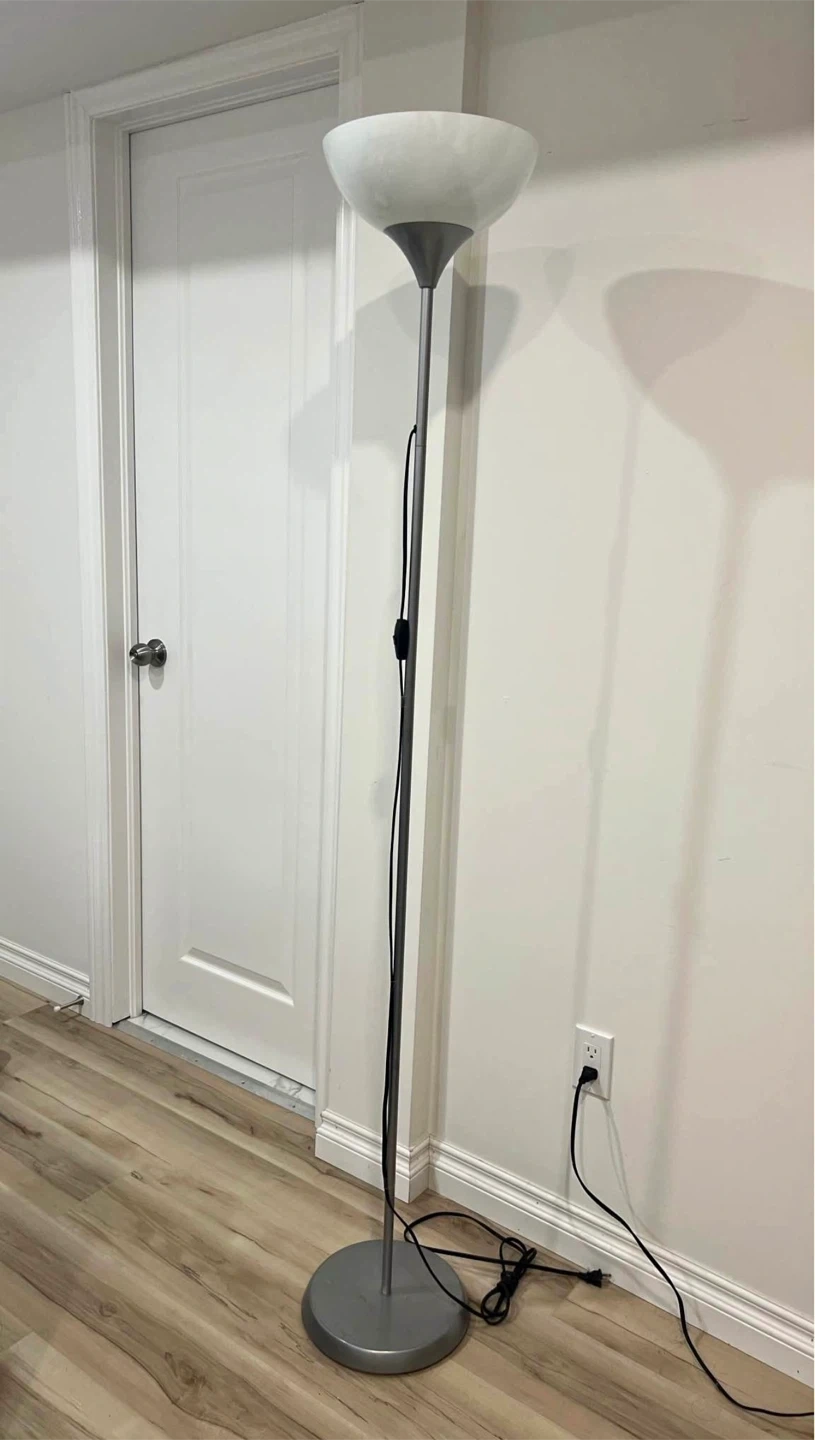 This is a grey standing lamp with a white frosted shade. It has a slim pole and a circular base. The cord has an inline on/off switch.