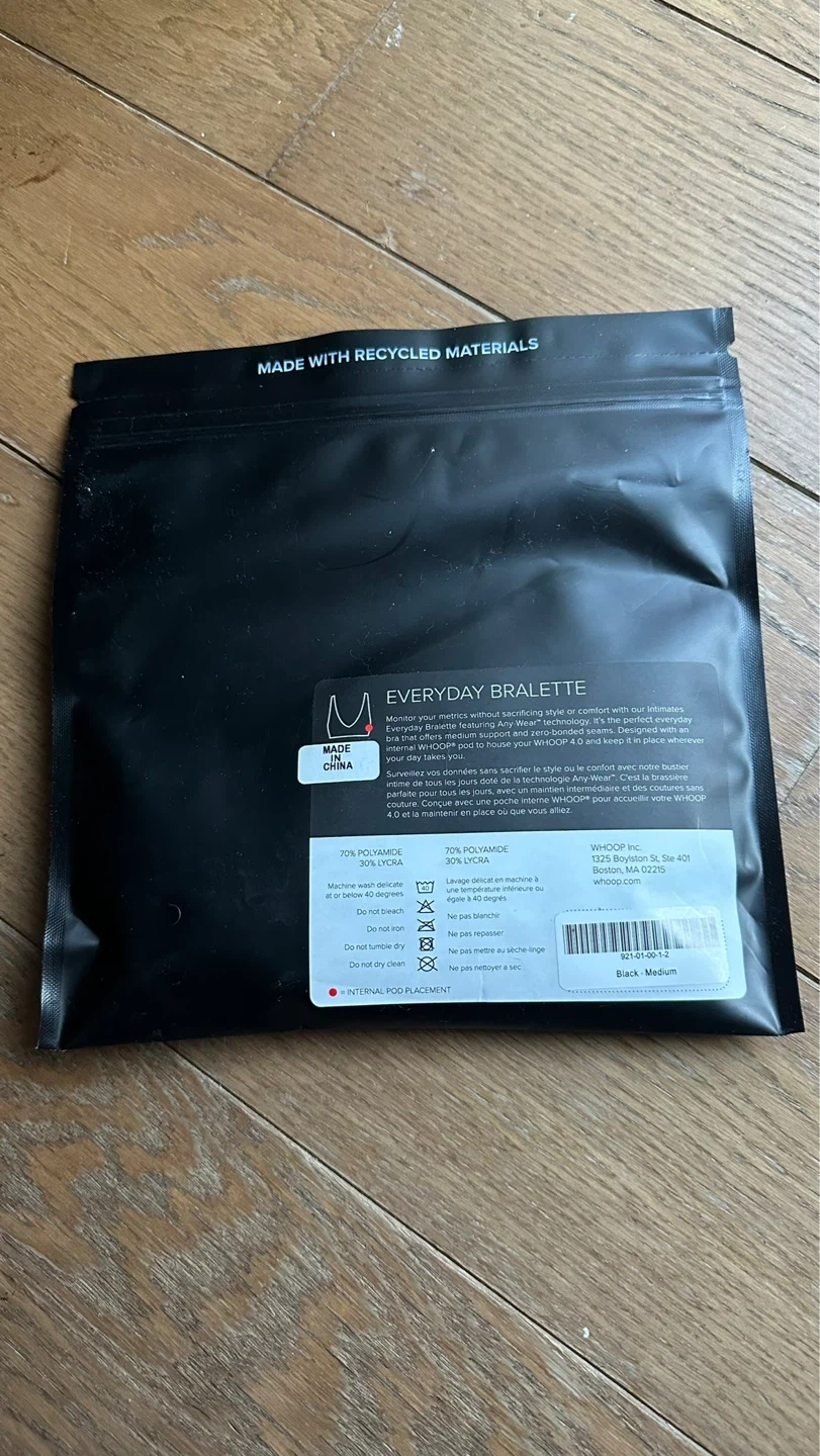 WHOOP BODY Everyday Bralette. Made with 70% polyamide and 30% Lycra. Designed for comfort and support, it's made with recycled materials. Internal pod placement.