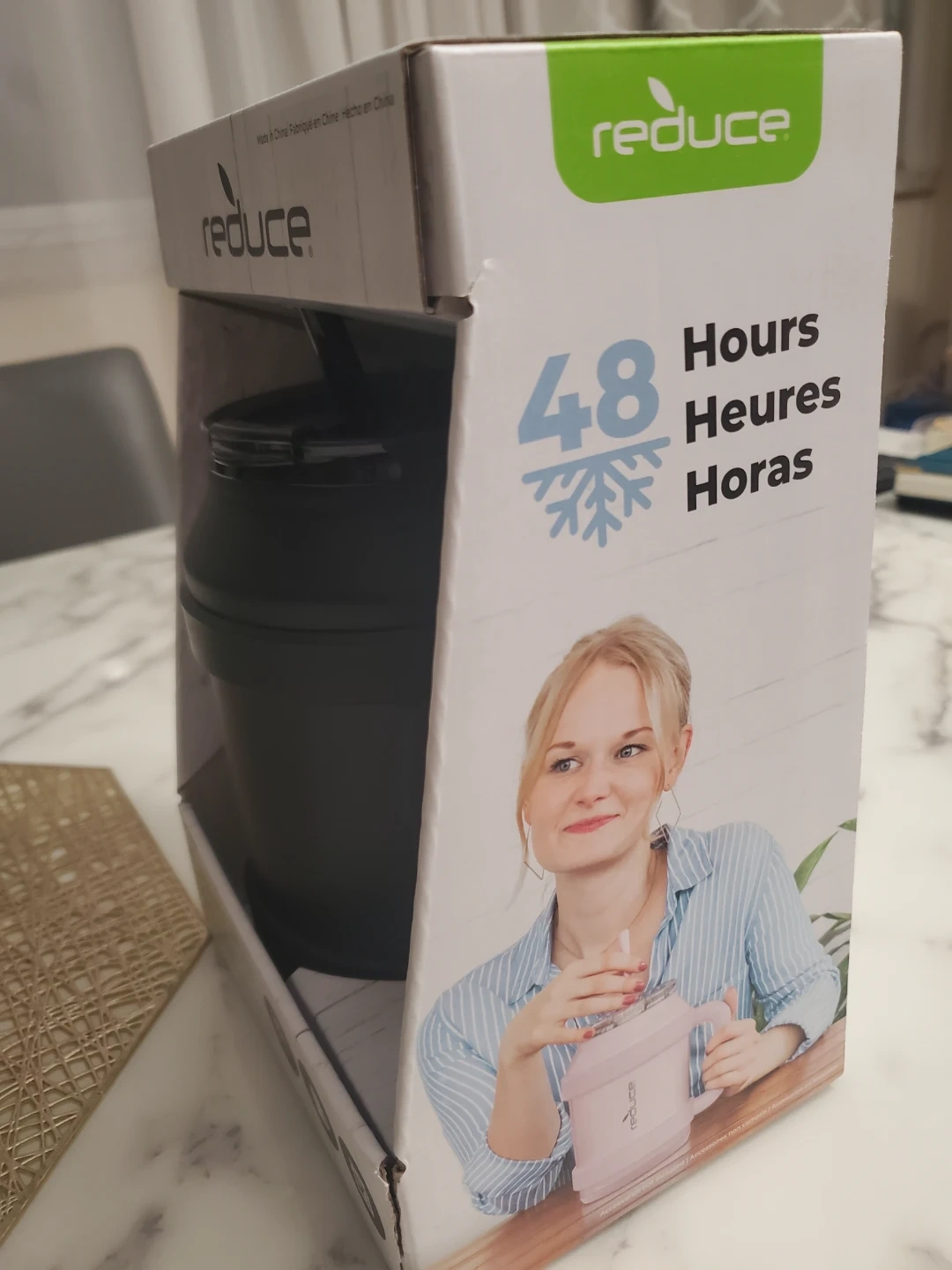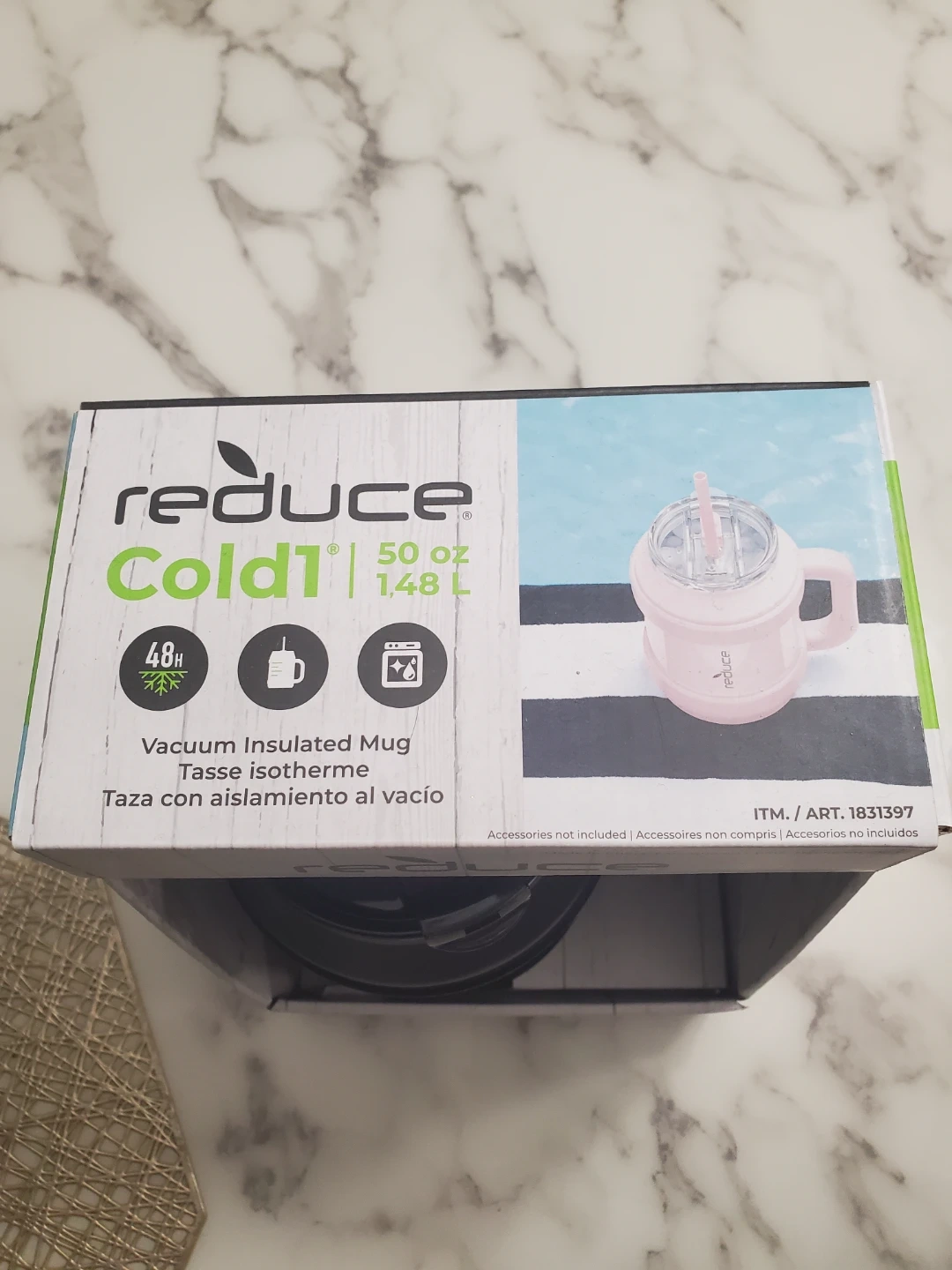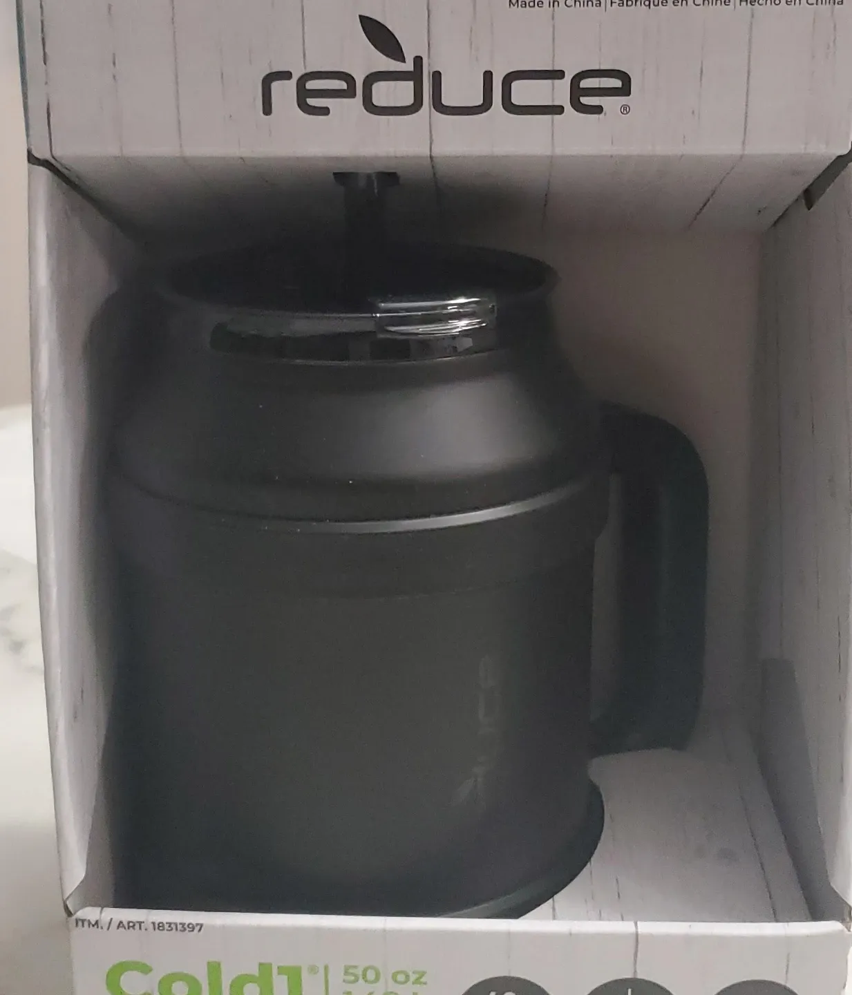 Keep your drinks cold for up to 48 hours with this Reduce Cold1 vacuum insulated mug! It's a 50 oz mug that comes with a 3-in-1 lid and internal capacity markers. The mug is black and comes in its original box