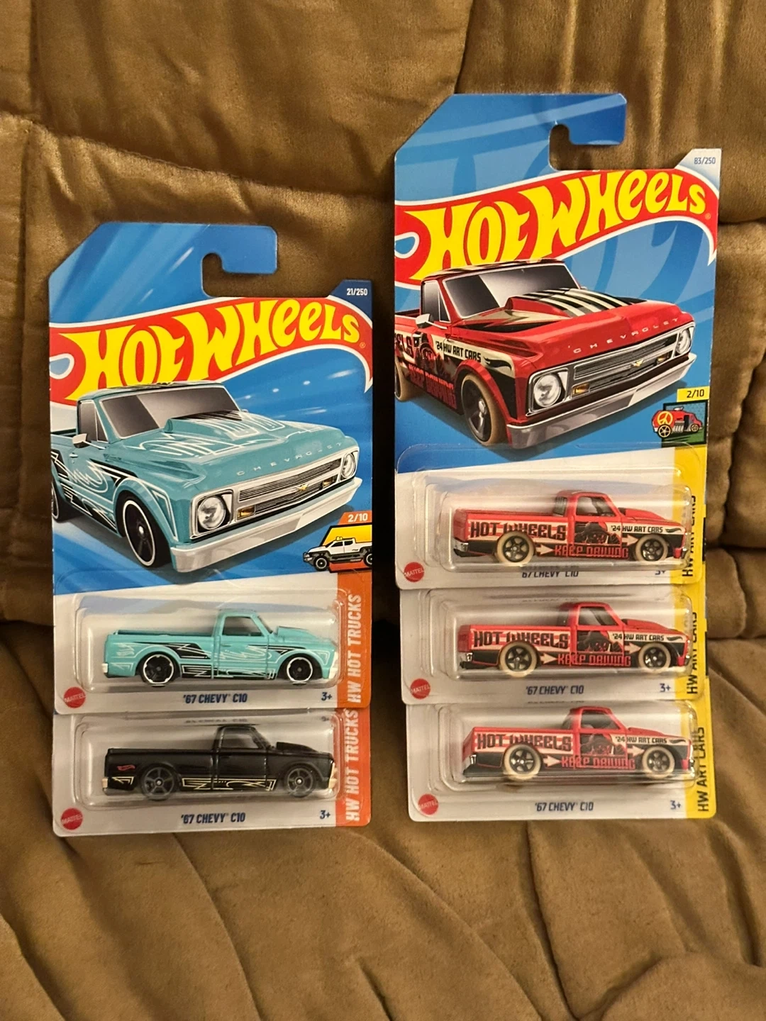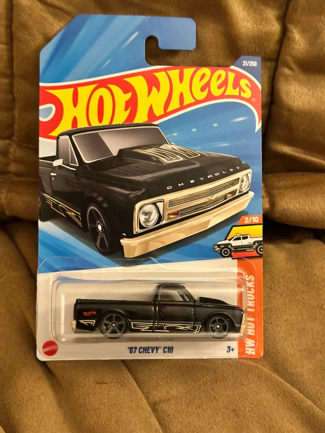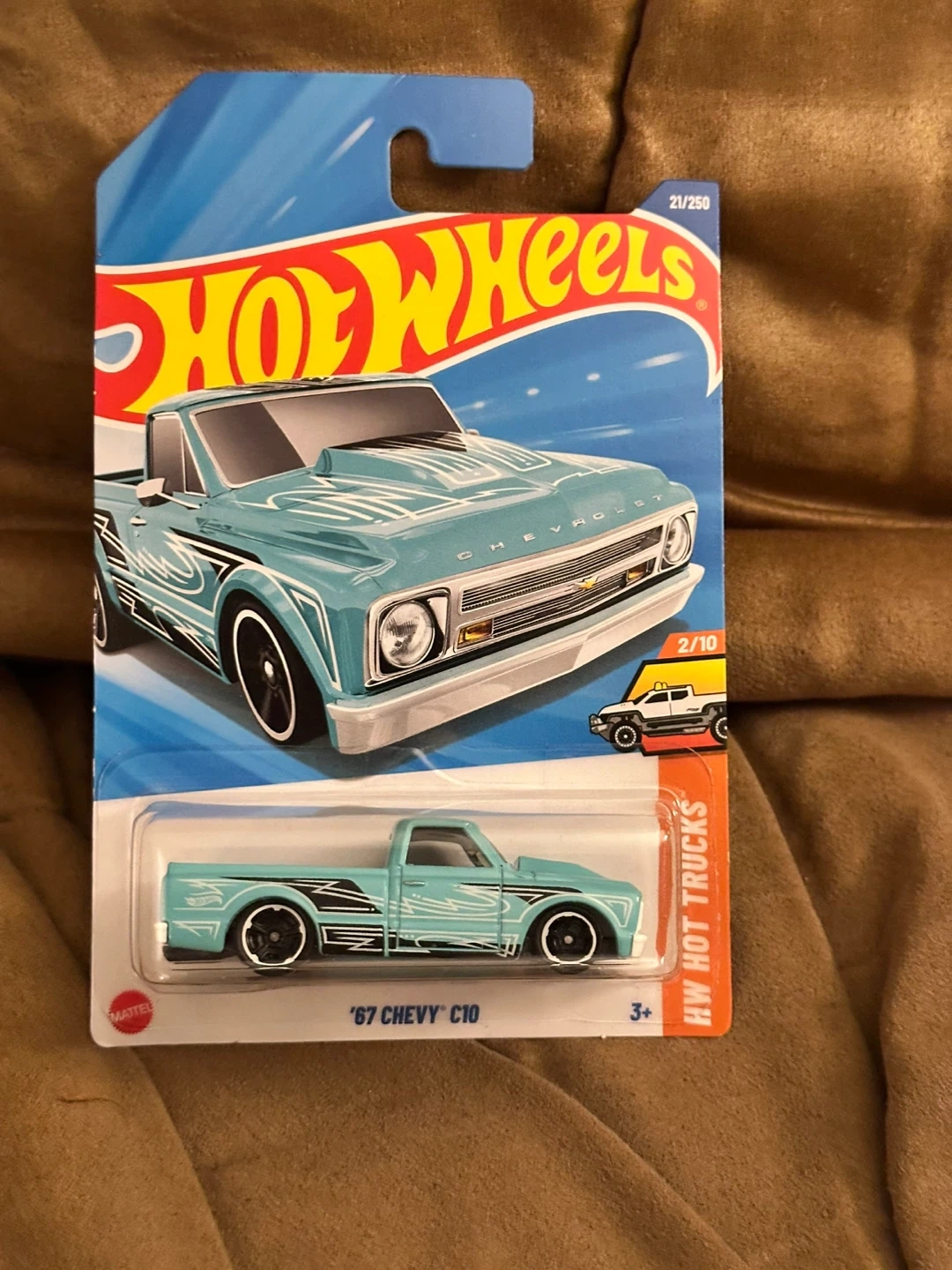 Get your hands on these cool Hot Wheels '67 Chevy C10 die-cast trucks. It's a fun collectible for enthusiasts! Assorted colours available.