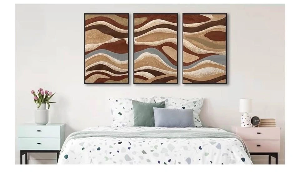 Set of 3 framed abstract art prints featuring brown mountain range designs with modern curved shapes. Rustic retro style canvas pictures, perfect for living room, bedroom, or office. Each piece measures 40cm x 60cm.