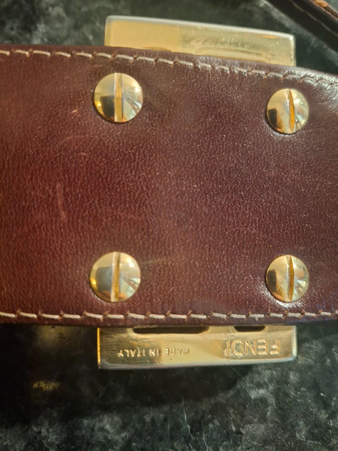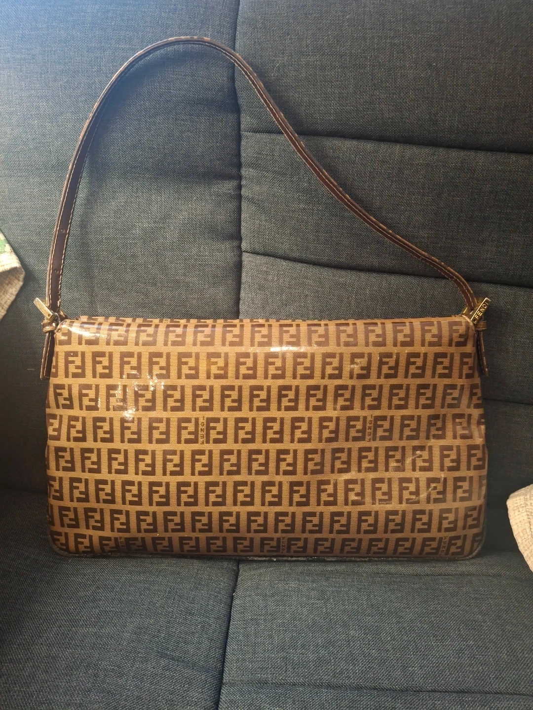 Authentic Vintage Fendi bag in good condition! The bag has a brown Fendi logo pattern and brown leather detailing.