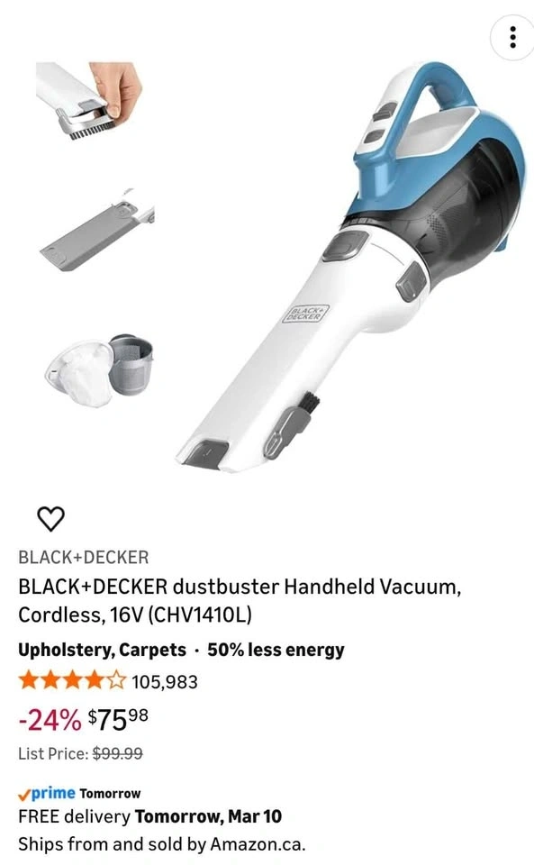 Buy & SellBlack + Decker Cordless Hand Vacuum CleanerBlack + Decker Cordless Hand Vacuum Cleaner$30Lightweight (3lbs) but powerful with good suction. Great for cleaning small messes in the house and car.ConditionLike newWHERE TO MEETCheck LocationView MapSELLERverifiedAnthonyRural Vaughan600 reviews2 chats·0 favorites·6 viewsSEND CHAT TO SELLERHi Anthony! I’m interested in your listing.Hi Anthony! I’m interested in your listing.Get the Karrot app to chatSign In to chat