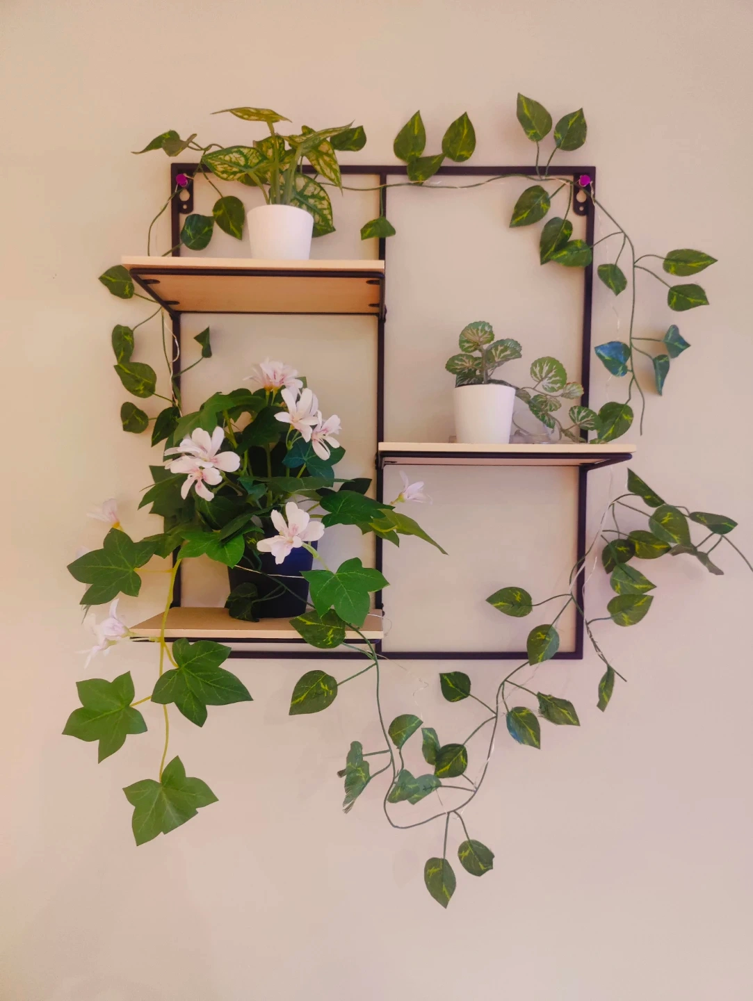 This wall unit features a black metal frame with two light wood shelves. It's decorated with artificial green vines and assorted artificial plants in white pots. Great for adding a decorative touch to any room!