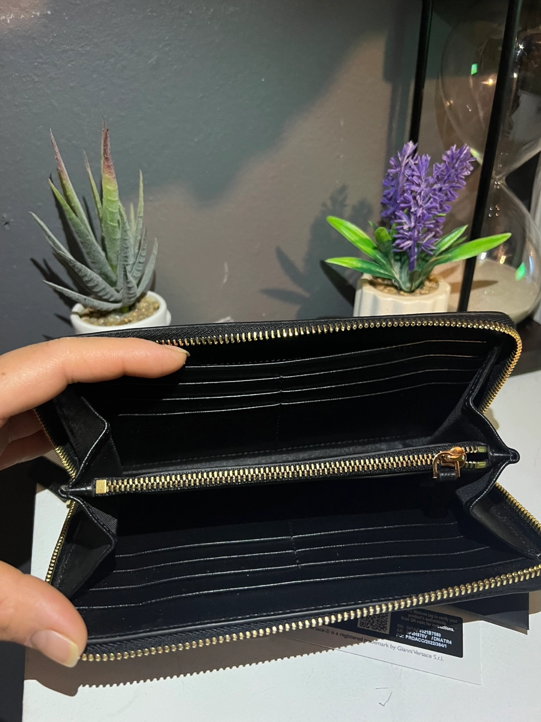 This is a black leather zip-around wallet from Versace. It features the iconic Medusa head emblem. Multiple card slots and compartments inside.