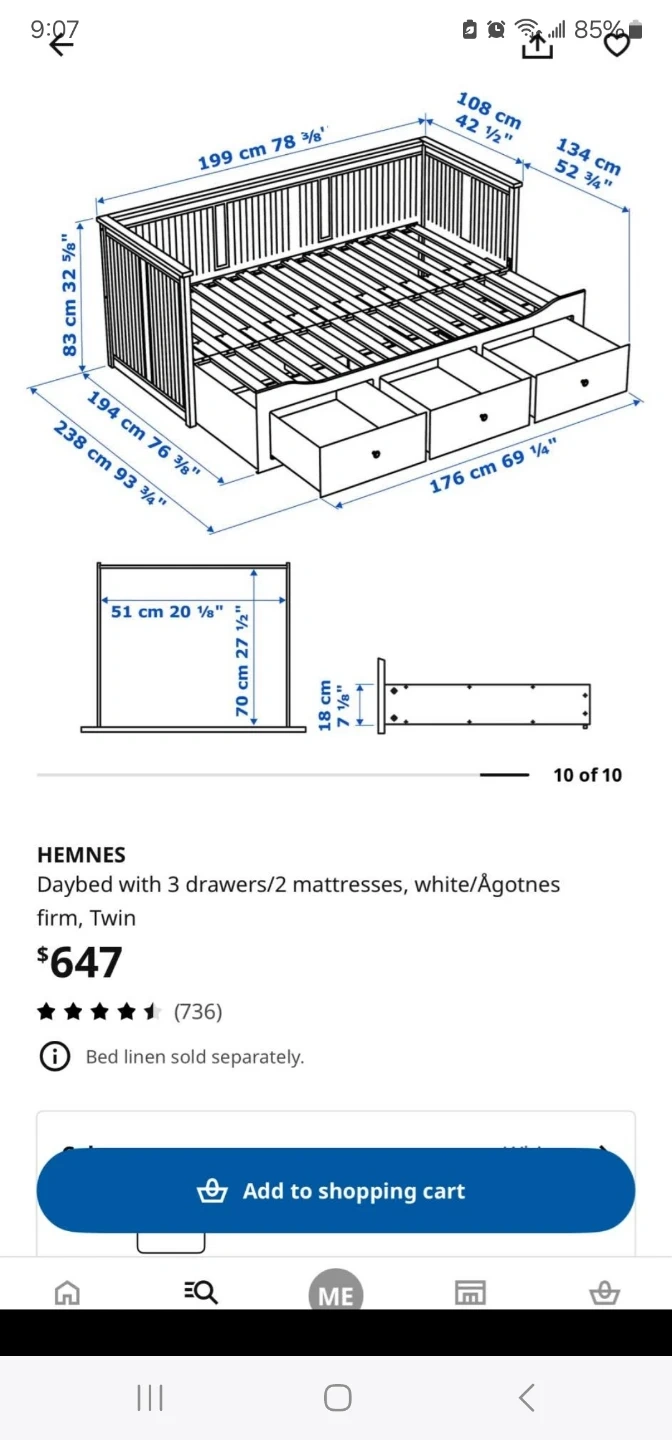 This white Hemnes daybed from IKEA comes with three drawers for ample storage. It's designed to fit two mattresses and has a twin size. The wooden slatted base provides good support. Use it only one year make me offer