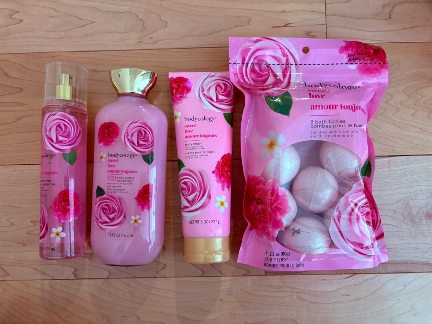 Bodycology bath and body gift set. Includes body wash, body cream, fragrance mist, and bath fizzies. Sweet rose scent. Unopened.