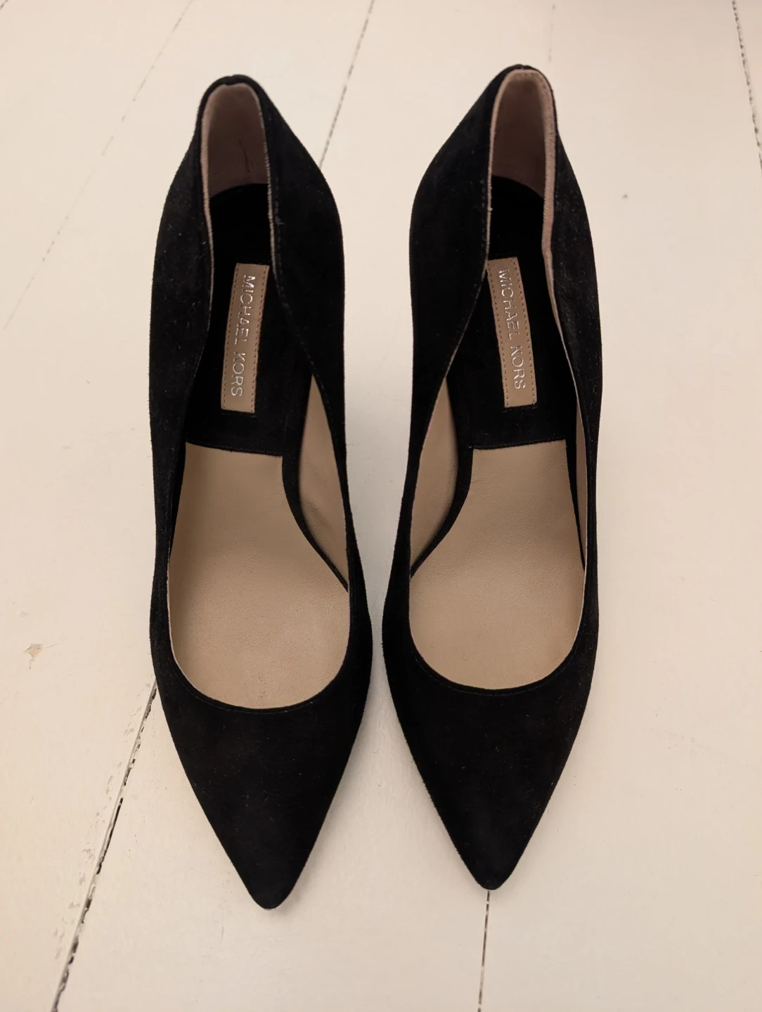 Classic Michael Kors suede pumps in black. Features a pointed toe and a sleek heel. Verano Cuoio sole. Perfect for dressing up any outfit!