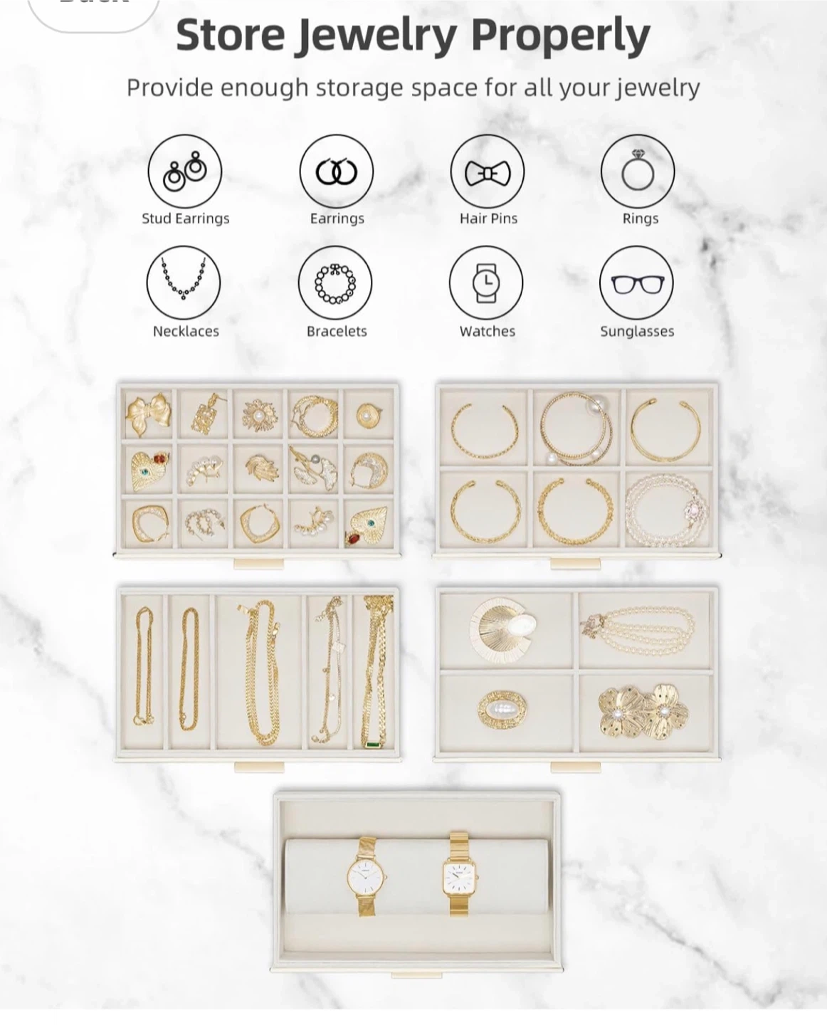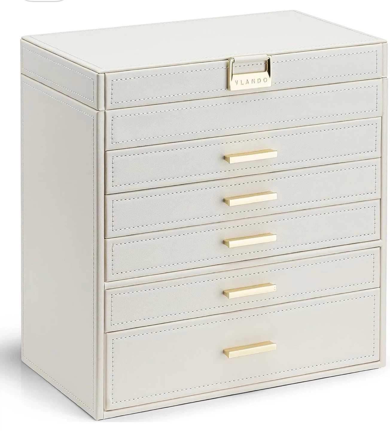 Keep your jewelry neatly organized with this Vlando jewelry box organizer! It features a soft velvet lining to protect your precious items and a line leather design for a touch of elegance. The high-quality handles make it easy to access your jewelry, and the multiple drawers provide ample storage space for stud earrings, earrings, hair pins, rings, necklaces, bracelets, watches, and sunglasses
