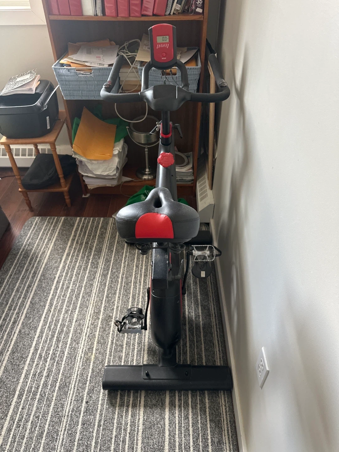 This is a SuperFit spin bike with an adjustable seat and handlebars. It features a digital display to track your workout metrics. Great for indoor cardio!