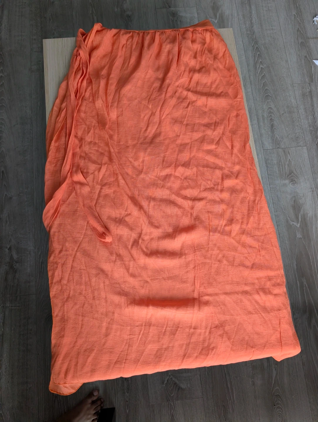 This is an orange maxi skirt. It's made of a lightweight, flowy fabric. It has a tie waist for an adjustable fit.