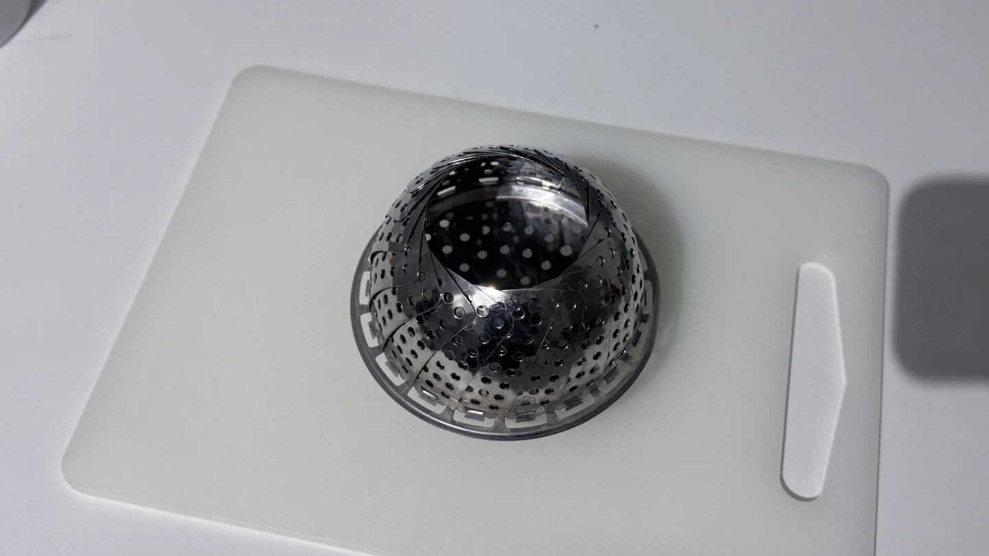 This is a stainless steel steamer basket. It's made of durable metal with many small holes for steaming food. It folds down for compact storage.