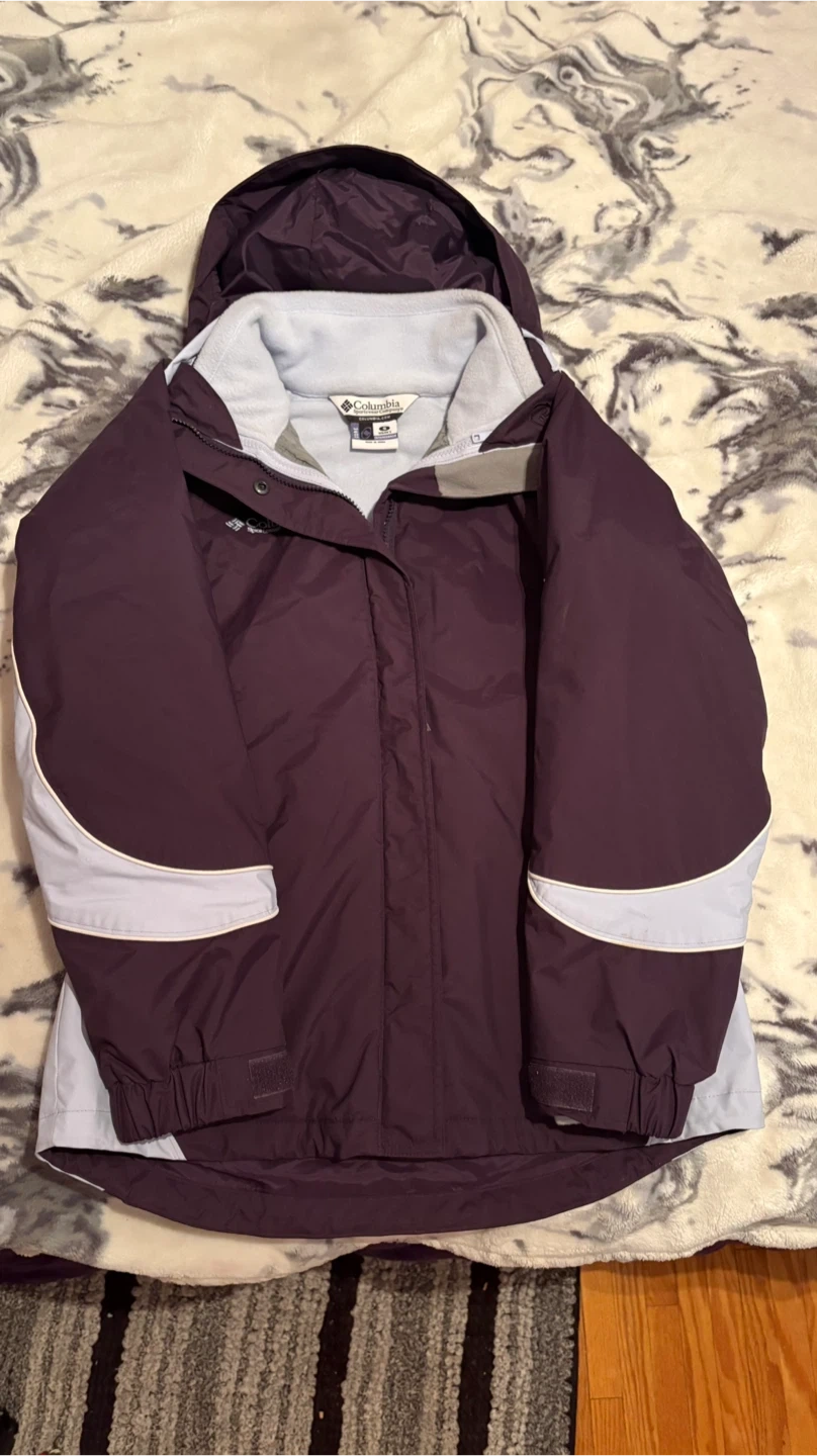 Columbia women's ski jacket in purple. This jacket has a fleece-lined interior and a waterproof outer shell. It's designed for cold weather activities.