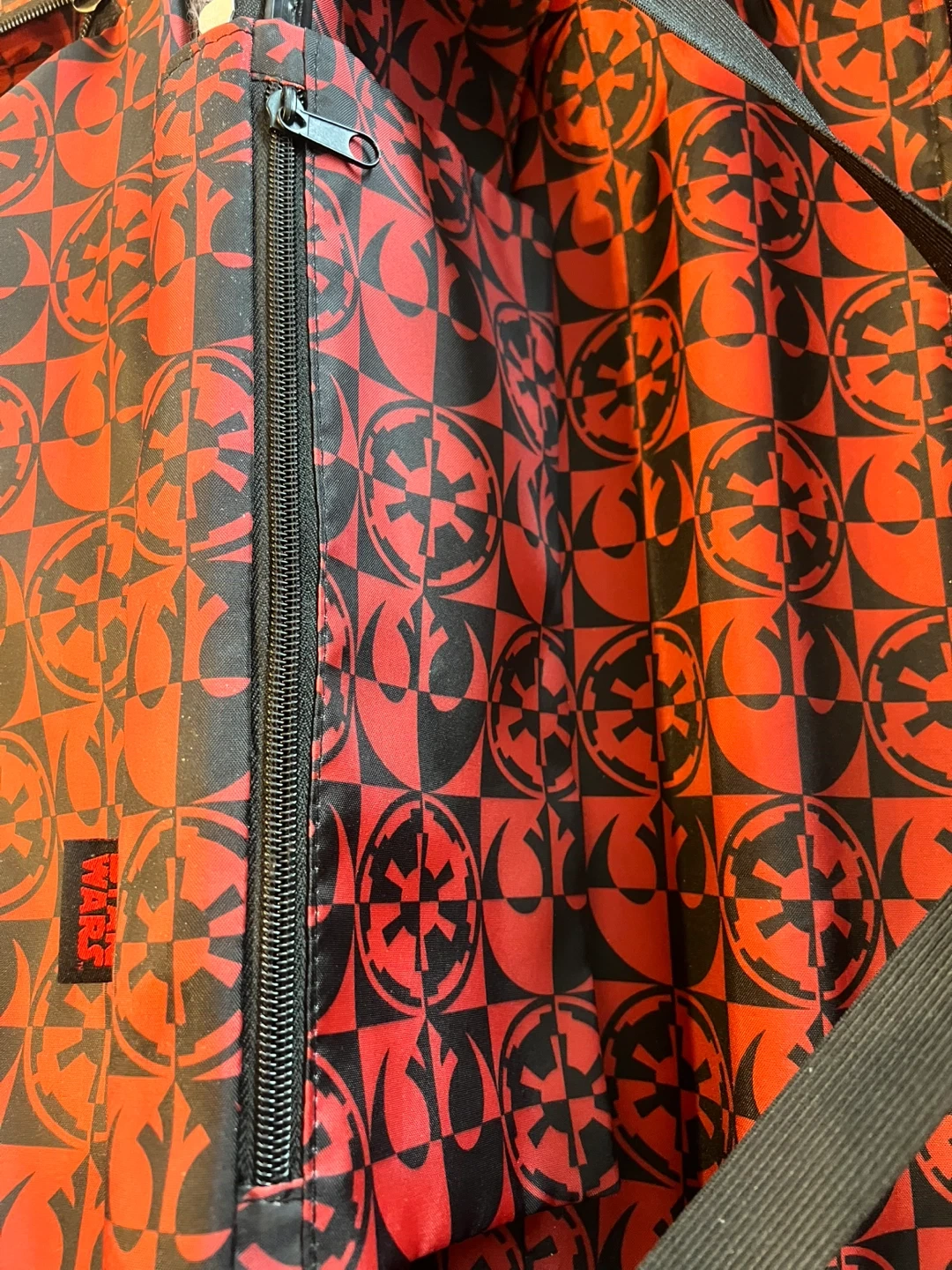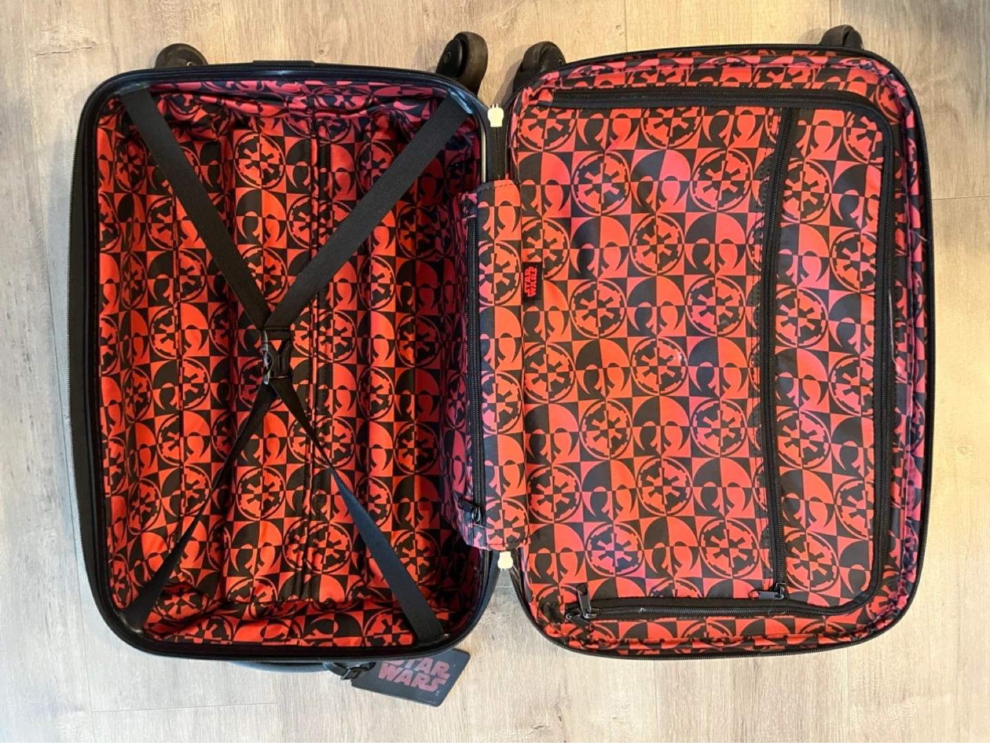 This is a rare black American Tourister rolling suitcase featuring a large Darth Vader graphic. It has a telescopic handle and four spinner wheels for easy manoeuvrability. The suitcase is made of durable hard-shell material and includes a Star Wars branded luggage tag. Wear outside , inside clean and excellent condition.