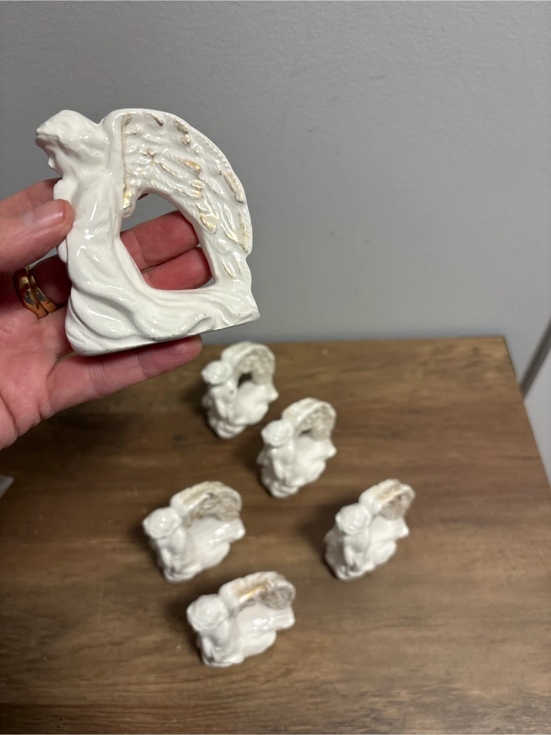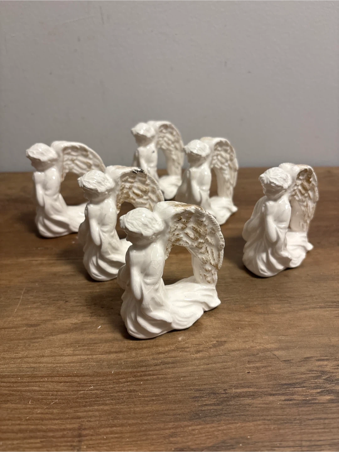 A set of six ceramic angel napkin rings. These charming rings add a touch of elegance to any table setting. White ceramic with gold accents on the wings. Perfect for holiday dinners or special occasions!