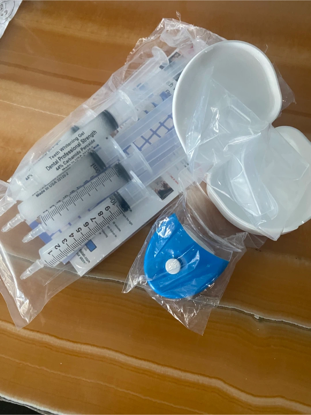 This kit includes 5 syringes of 44% Carbamide Peroxide Teeth Whitening Gel (3cc each), one LED accelerator light, one shade guide, and a set of upper and lower thermoforming whitening mouth trays. It also comes with a tray container storage case and instructions. This system supplies users with a professional strength teeth whitening kit.