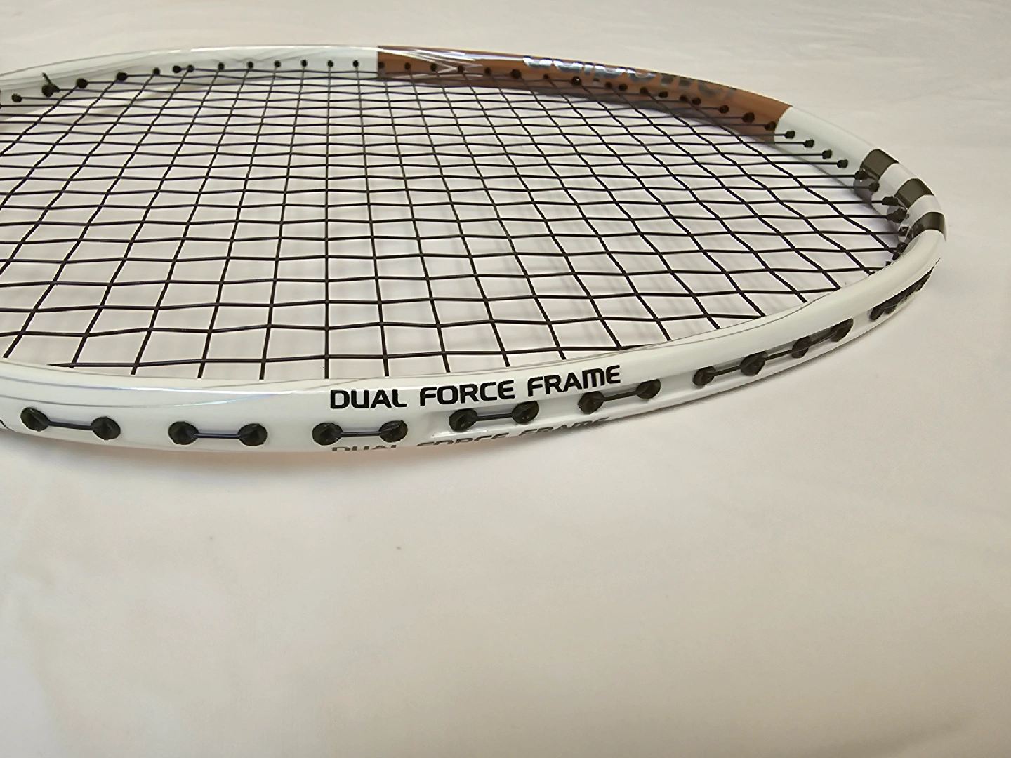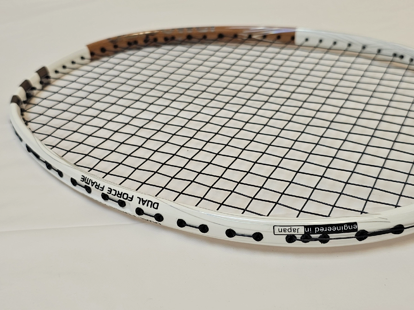 26Selling a badminton racquet with a Dual Force Frame! It's engineered in Japan and has a stiff flexibility. Here are some specs: - Weight: 89±2g - Balance: 283±3mm Strung with Exbolt 65 , 26lbs Black Strings Speedy racket with snappy reaction.
