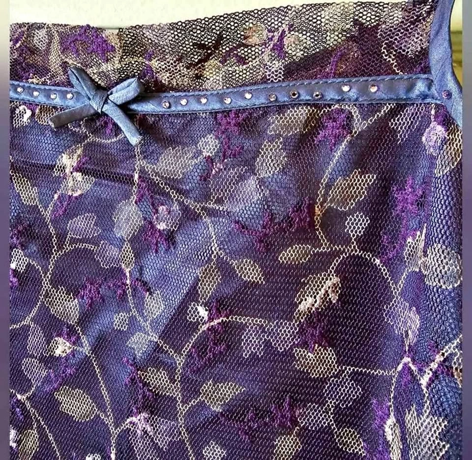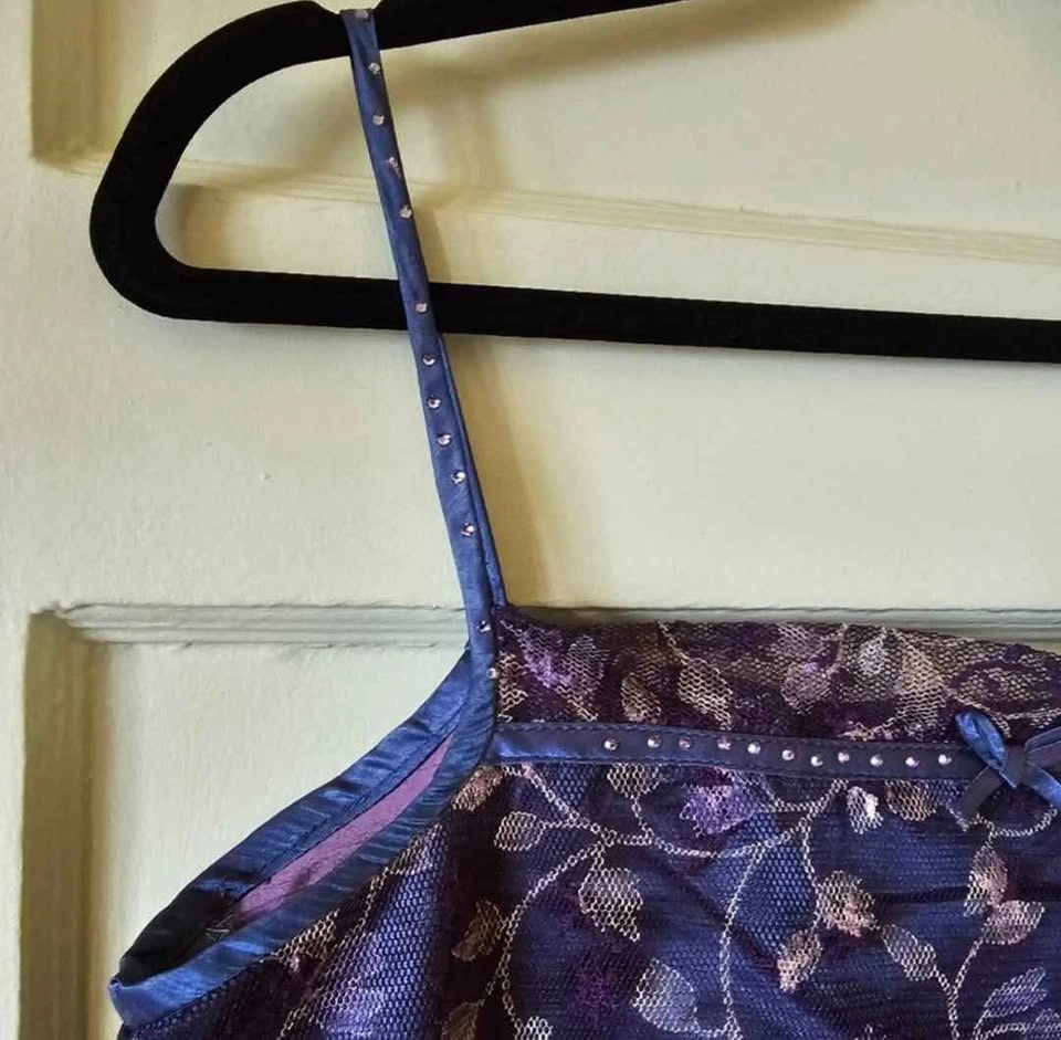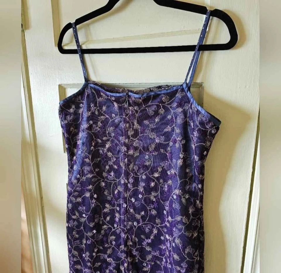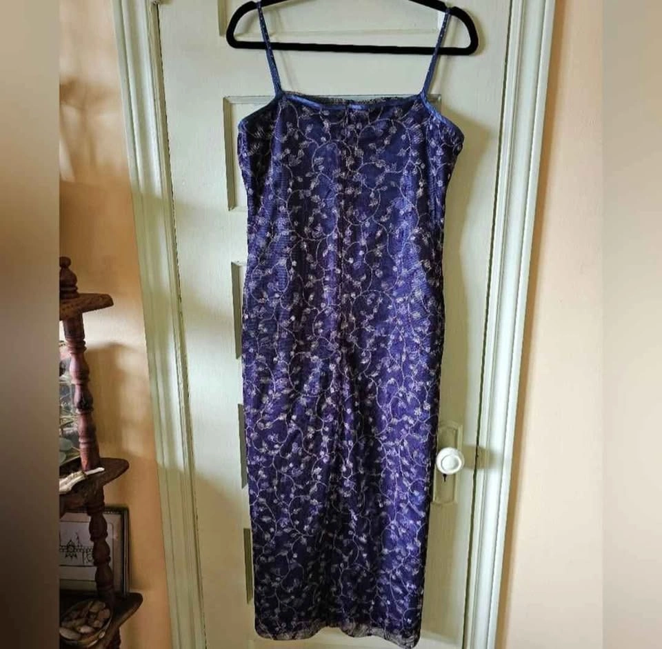 Amazing and unique true vintage strappy sheath style maxi dress from the brand Luna. Fully lined with a silky iridescent material that shimmers from muted dark blue to muted purple, and with a top layer of dark purple mesh covered in flowers and leaves! Dress is trimmed with the same iridescent material as the lining to form the straps and accents, and there are tiny purple rhinestones across the chest and on the straps. Looks fantastic on its own or with a long sleeve top underneath. Closes with a hidden rear zipper and has a slit in the back for ease of movement.