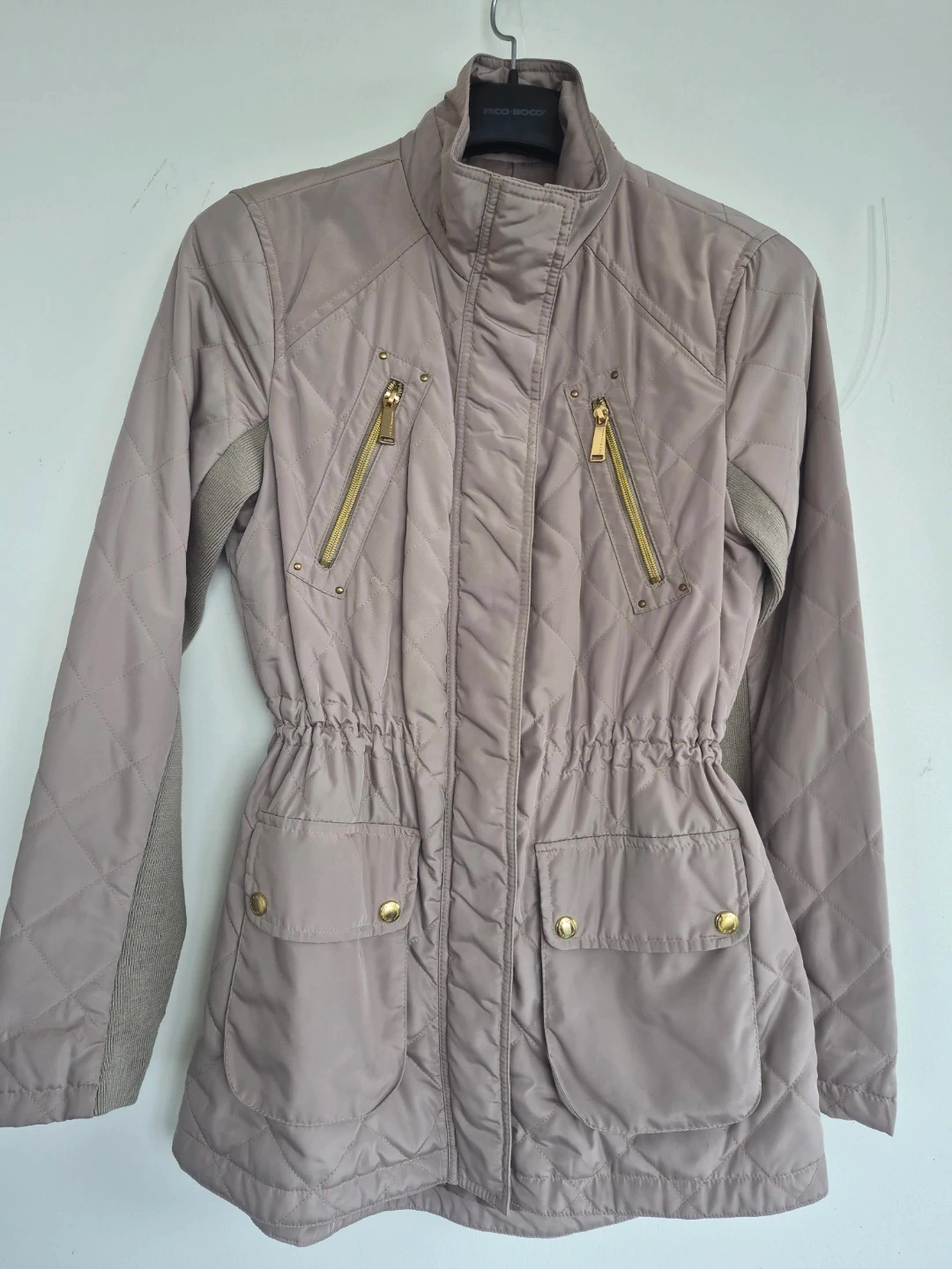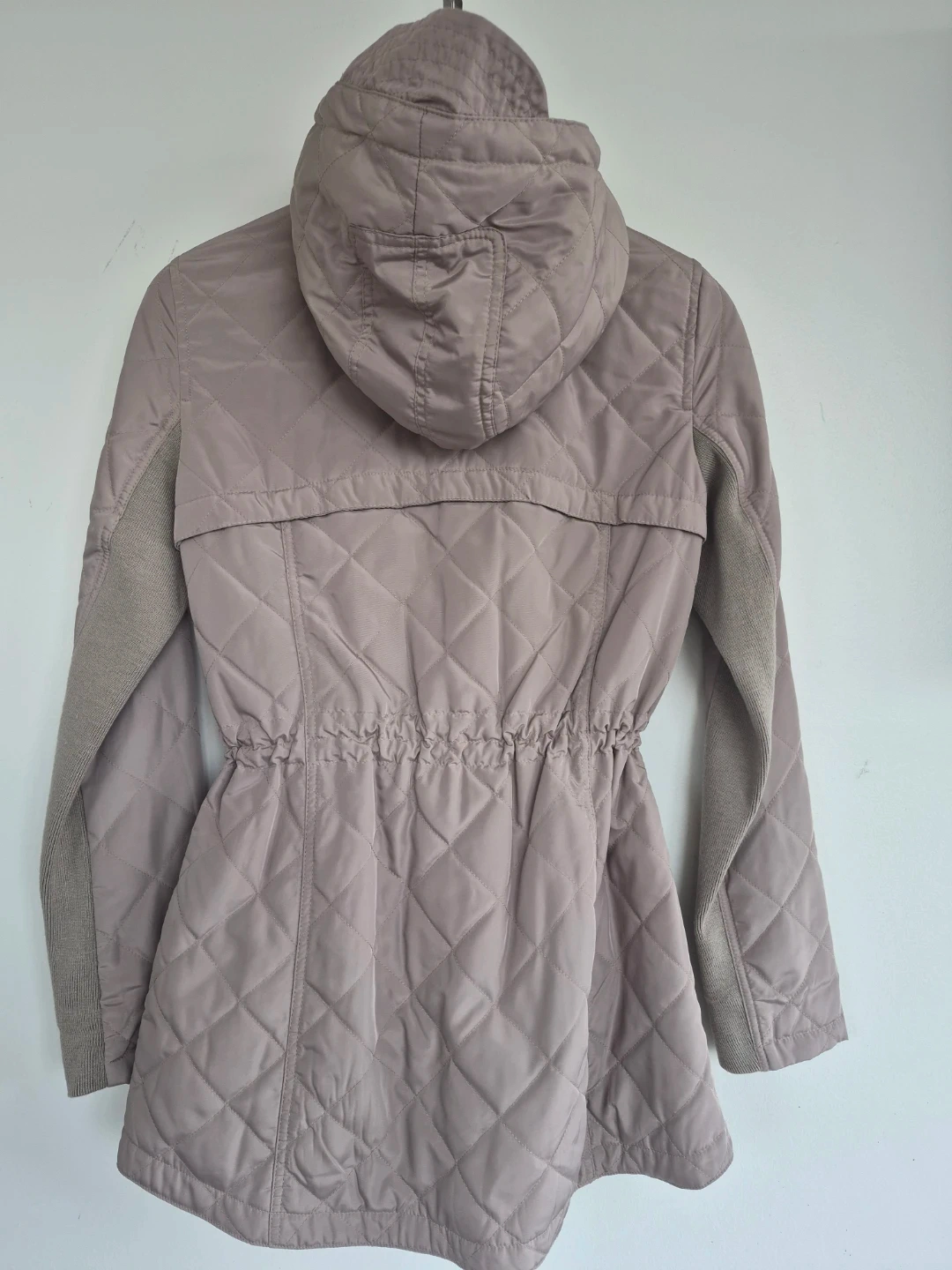 Quilted parka jacket with a drawstring waist. It's made with a blend of materials and features zippered pockets and a hood. Great for cooler weather!