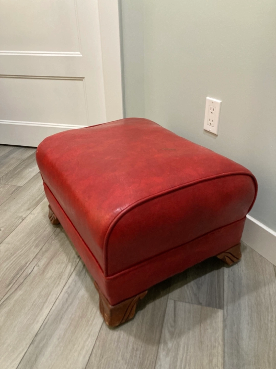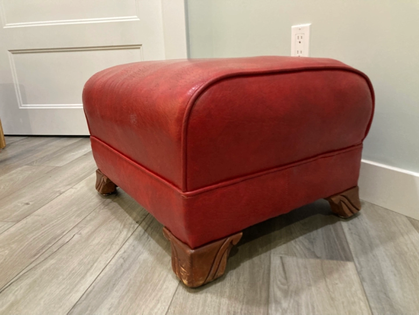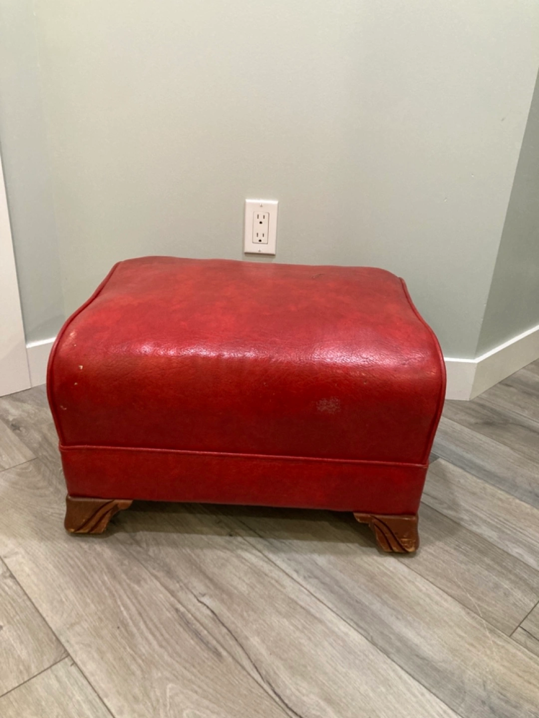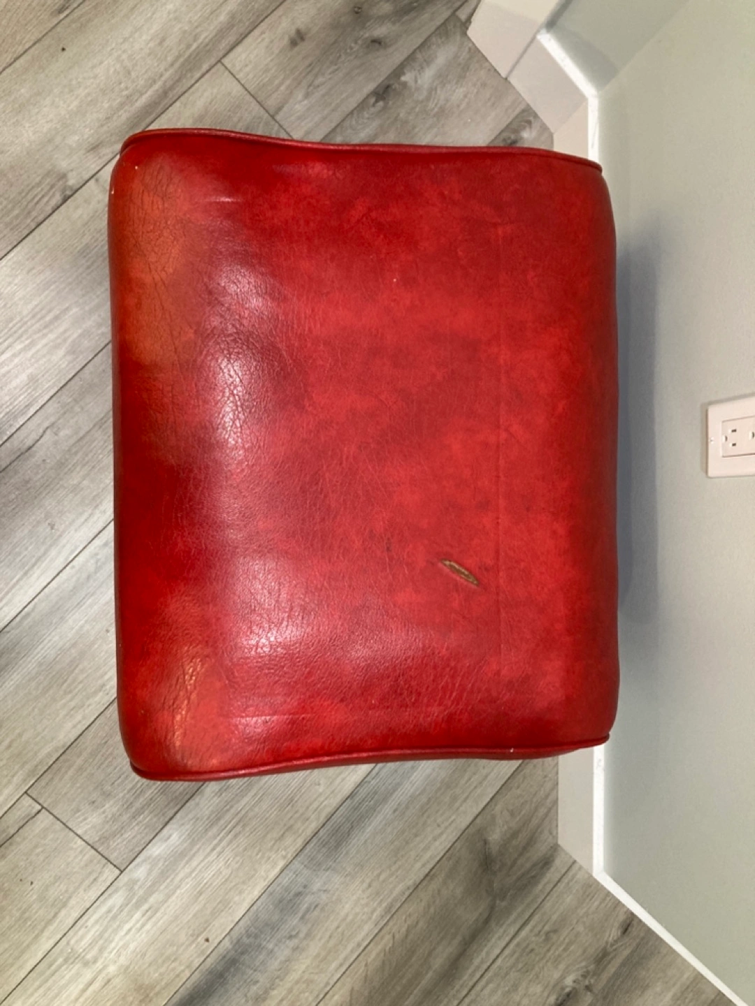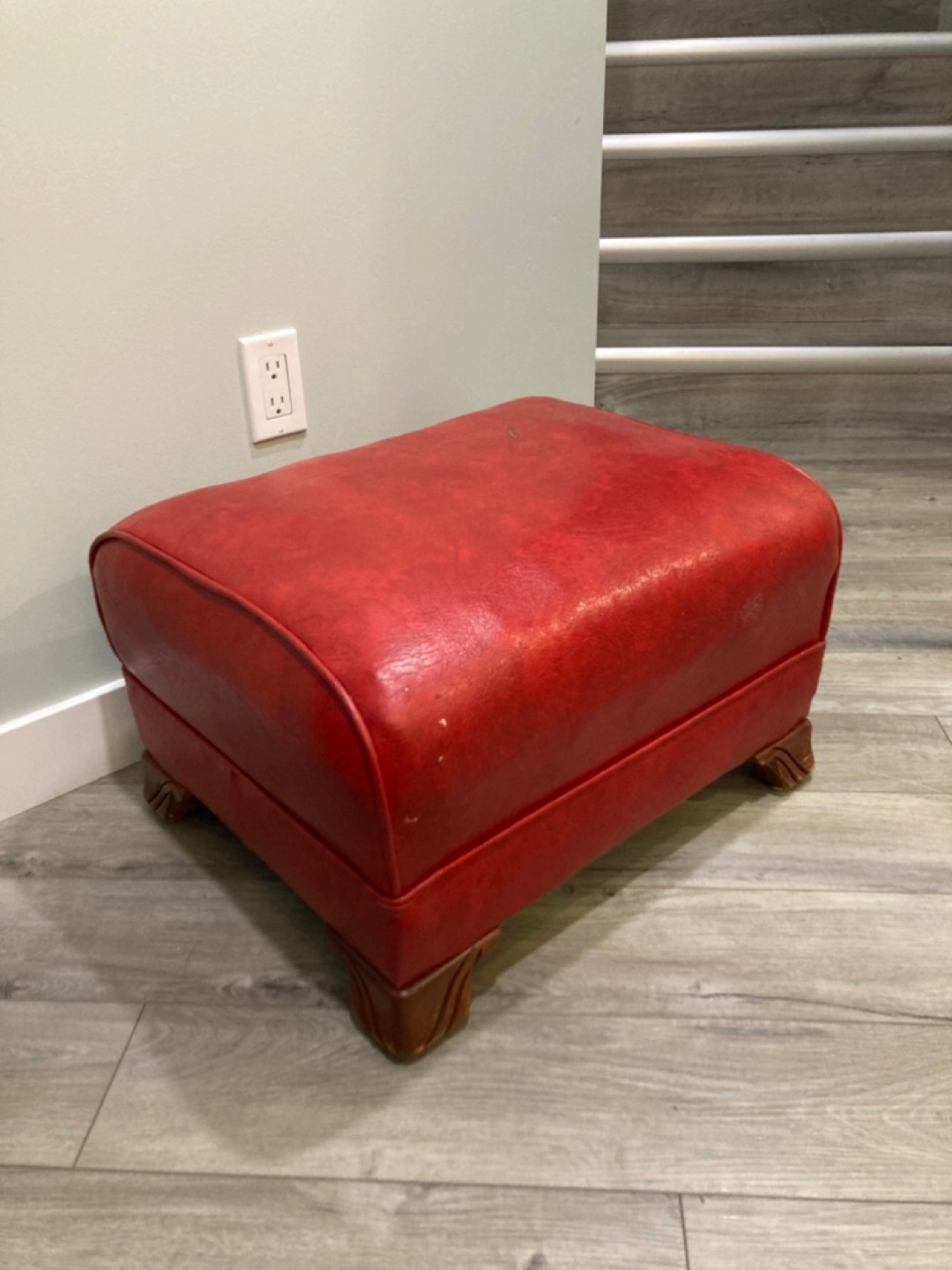 Red vinyl ottoman. Wooden legs. Shows some wear. Perfect for a vintage or retro home.
