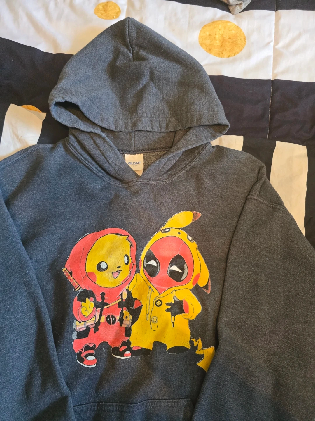 This Gildan hoodie is charcoal grey and features a fun graphic of Deadpool dressed as Pikachu and a Pikachu-like character dressed as Deadpool. It's a comfortable pullover style with a hood. Great for fans of both franchises!