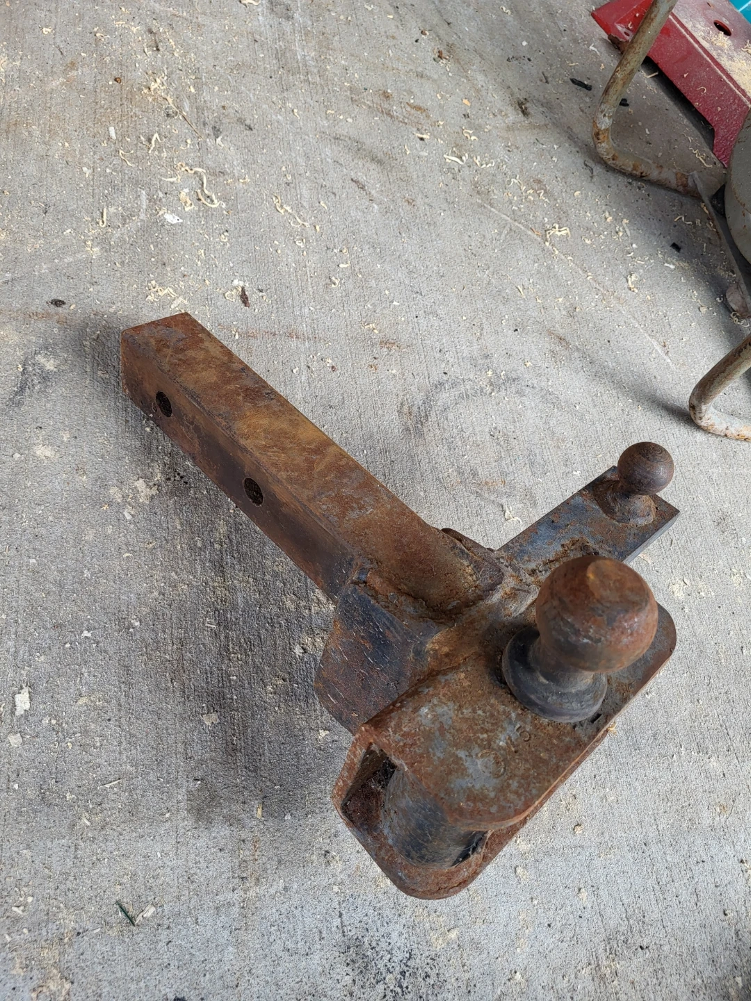 This is a rusty hitch ball mount. It has a 2-inch receiver size and a 2-inch ball. (I believe.) The mount extends about 7.5 inches from the receiver opening.