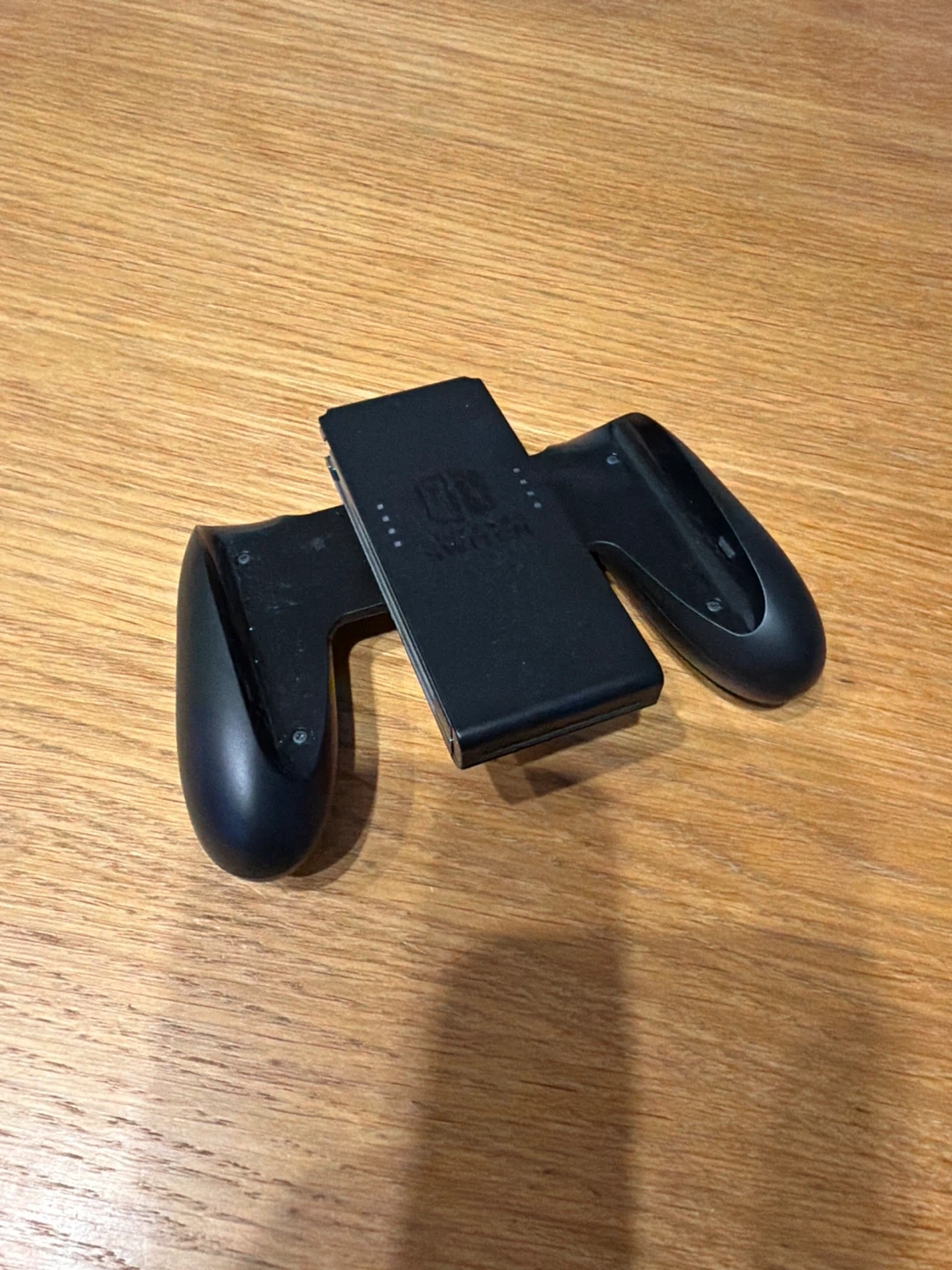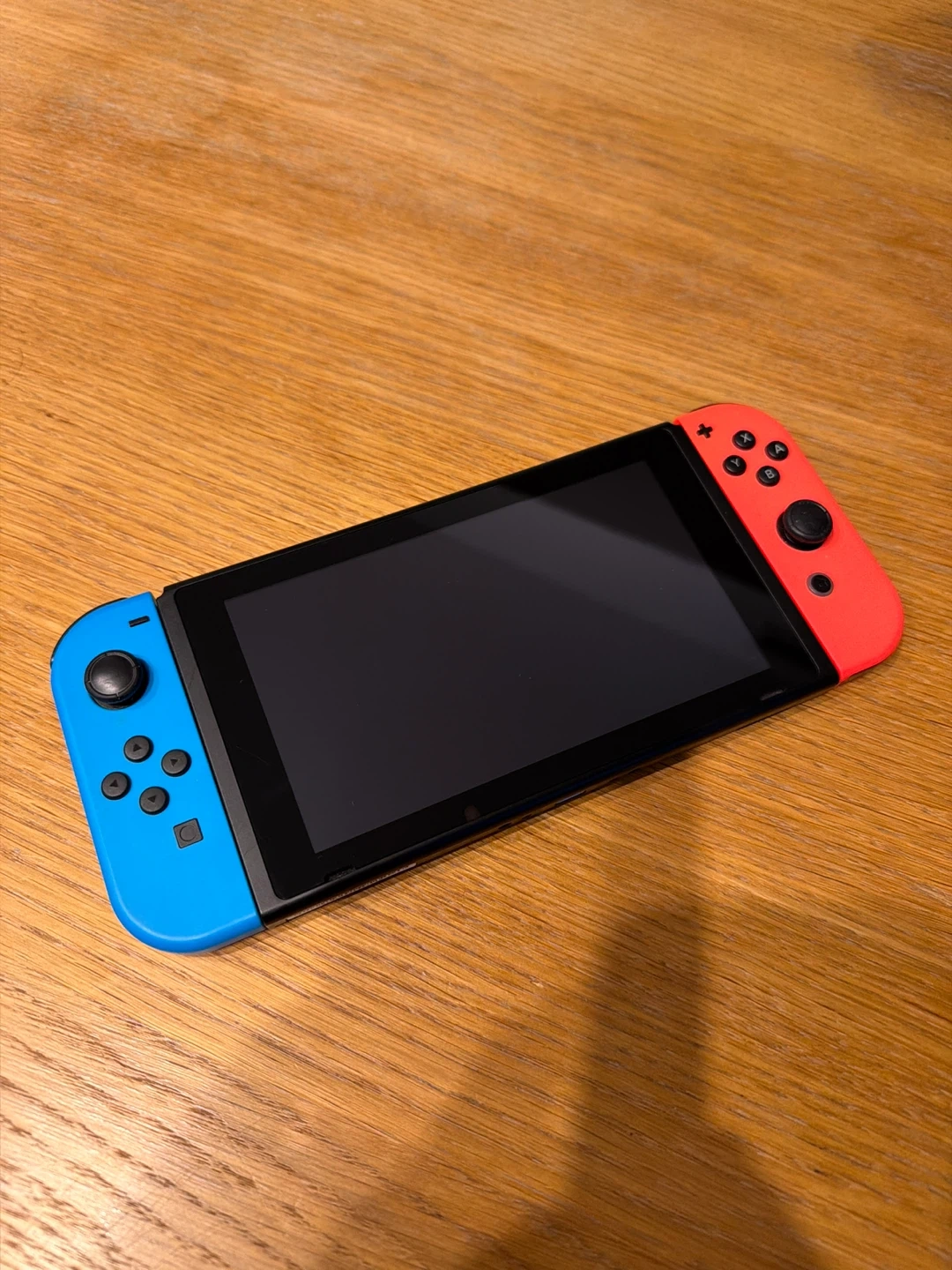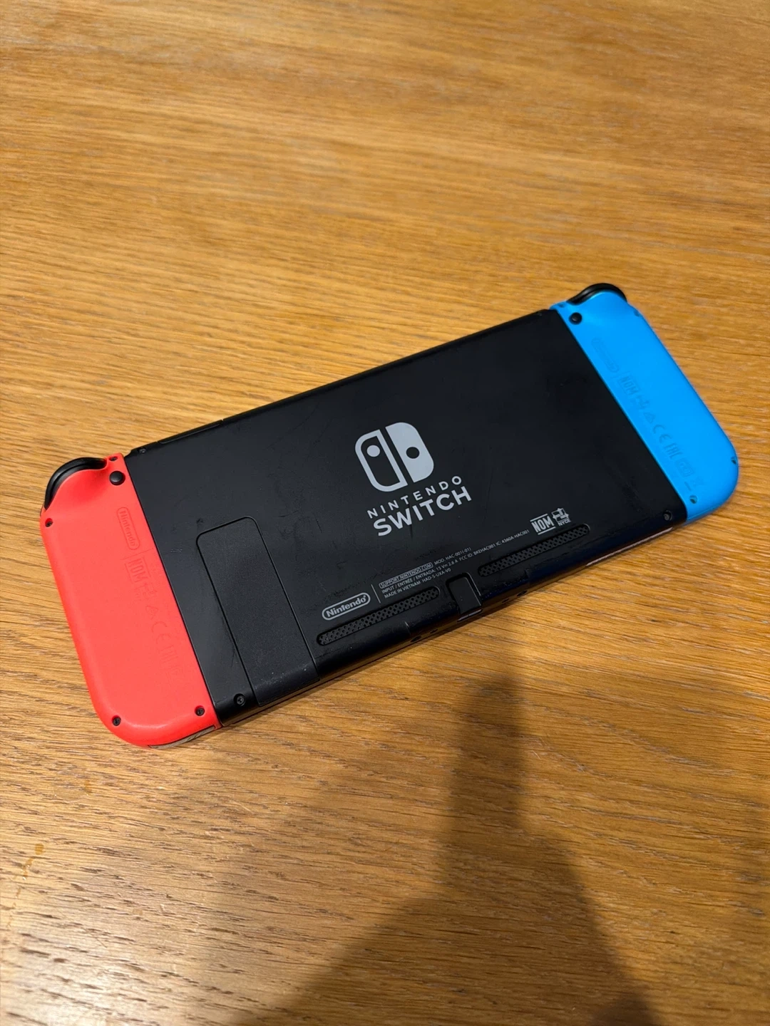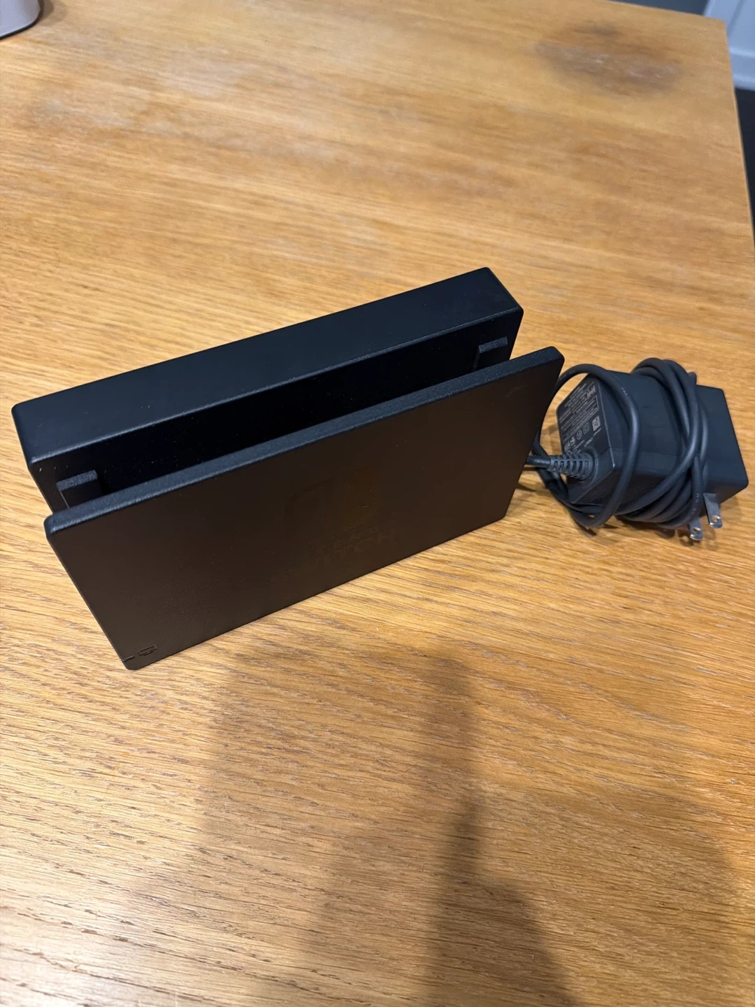 This is a Nintendo Switch console, complete with its dock and red and blue Joy-Cons. It also includes a charging grip. It's ready for gaming on the go or at home!