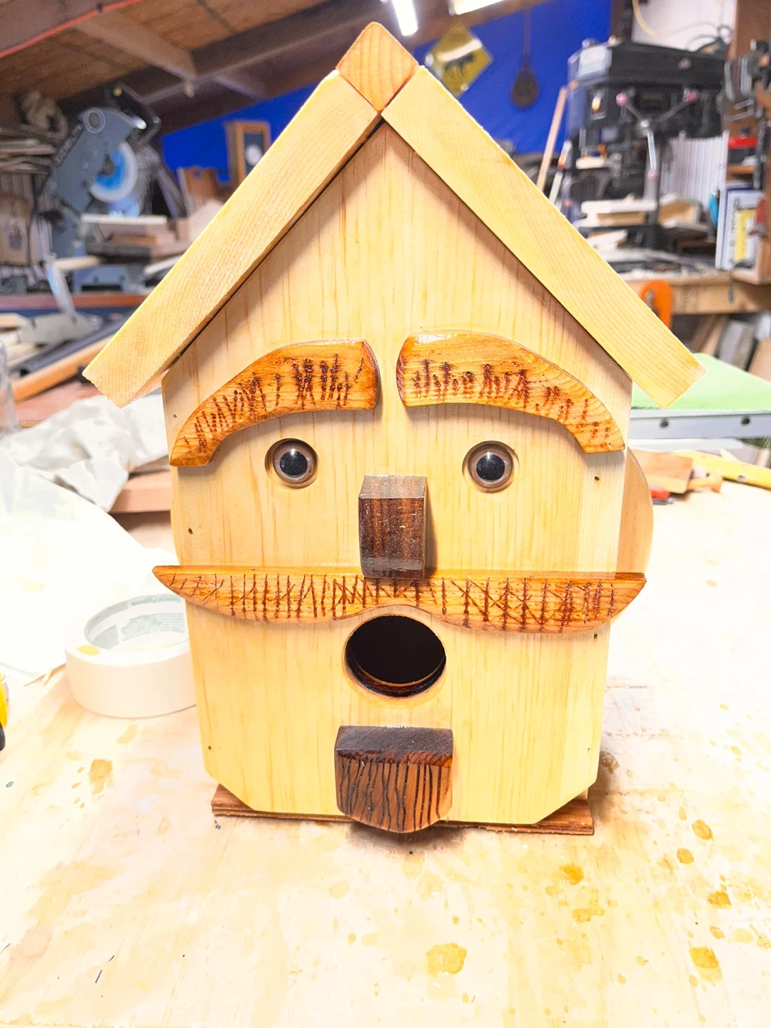 This unique wooden birdhouse is crafted with care. It's designed with whimsical facial features for a charming look. Perfect for adding a touch of personality to your garden!