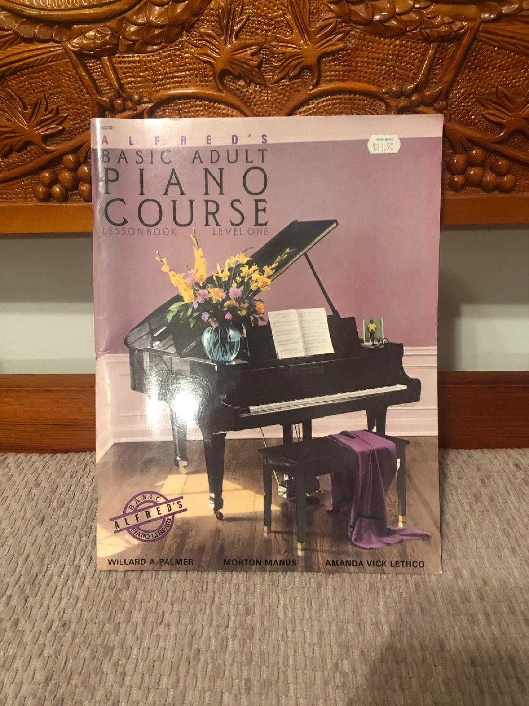 This is Alfred's Basic Adult Piano Course, Level One lesson book. It's written by Willard A. Palmer, Morton Manus, and Amanda Vick Lethco. This book is for beginners learning to play the piano.