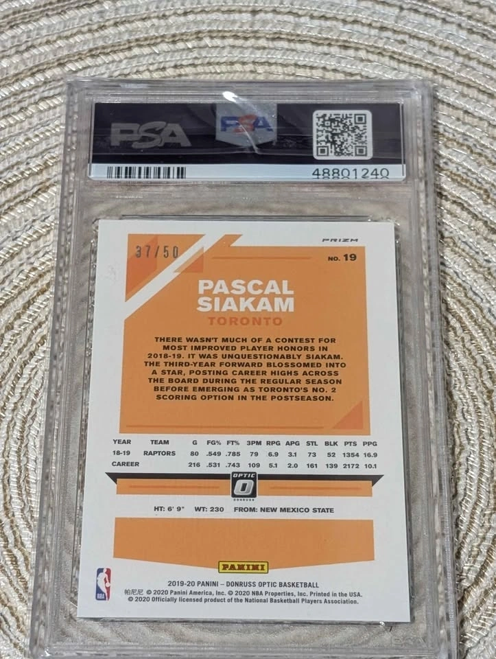 Graded card for sale! This a 2019 Panini Donruss Optic Pascal Siakam Fast Break Blue. It's a PSA 10 Gem Mint, so super clean. It's also numbered 37/50. Great for any Raptors fan or card collector!
