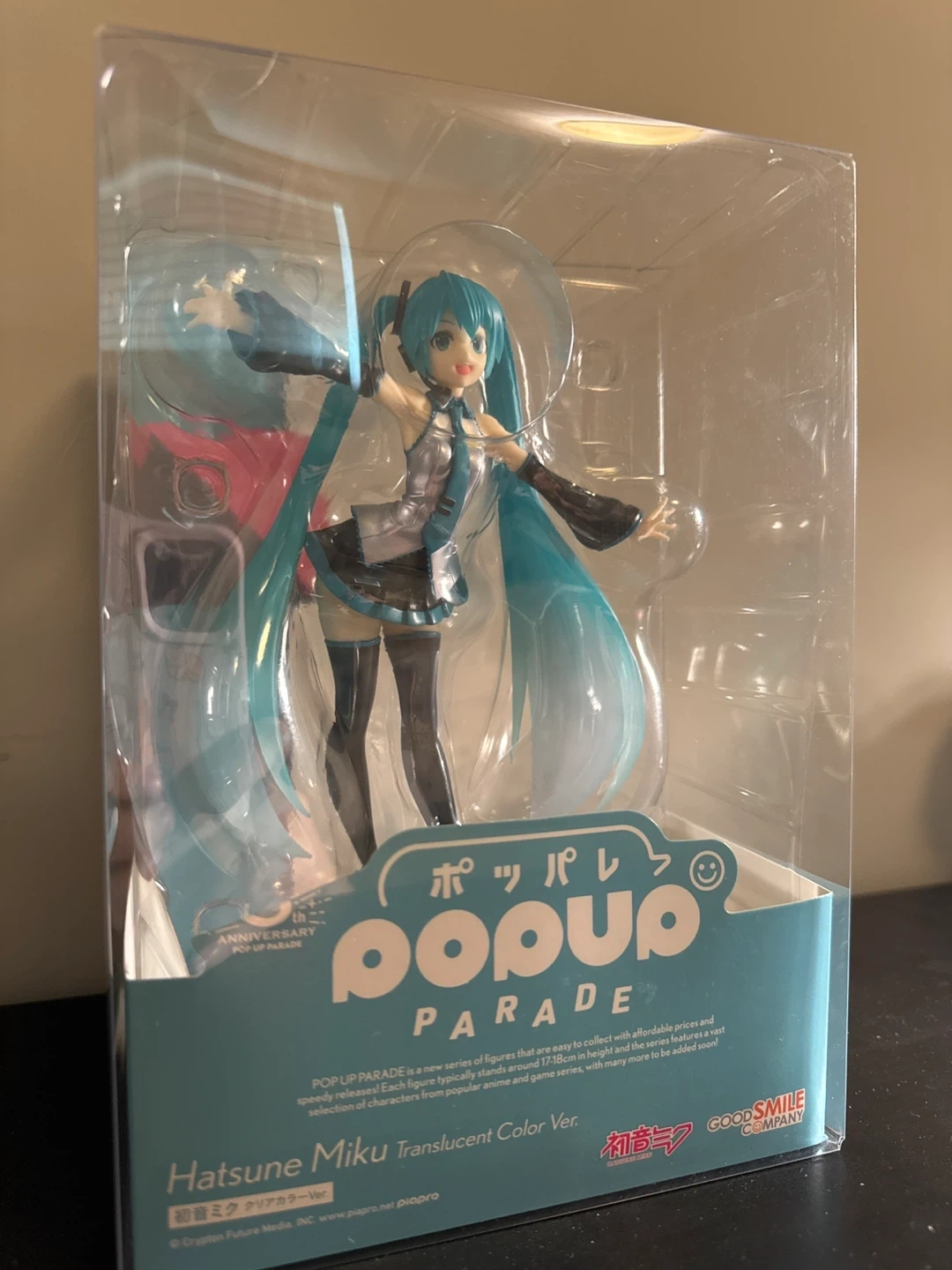 This is the Hatsune Miku Translucent Color Ver. figure from the POP UP PARADE series. It's a collectible figure featuring the popular virtual singer. The figure stands around 17cm tall and is made by Good Smile Company.