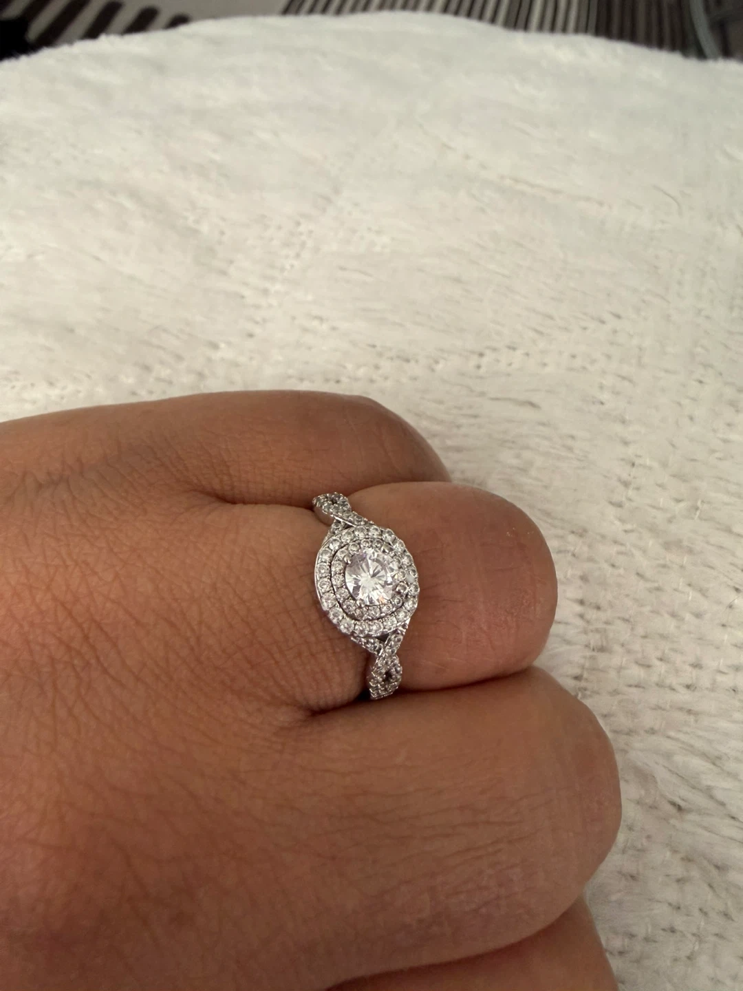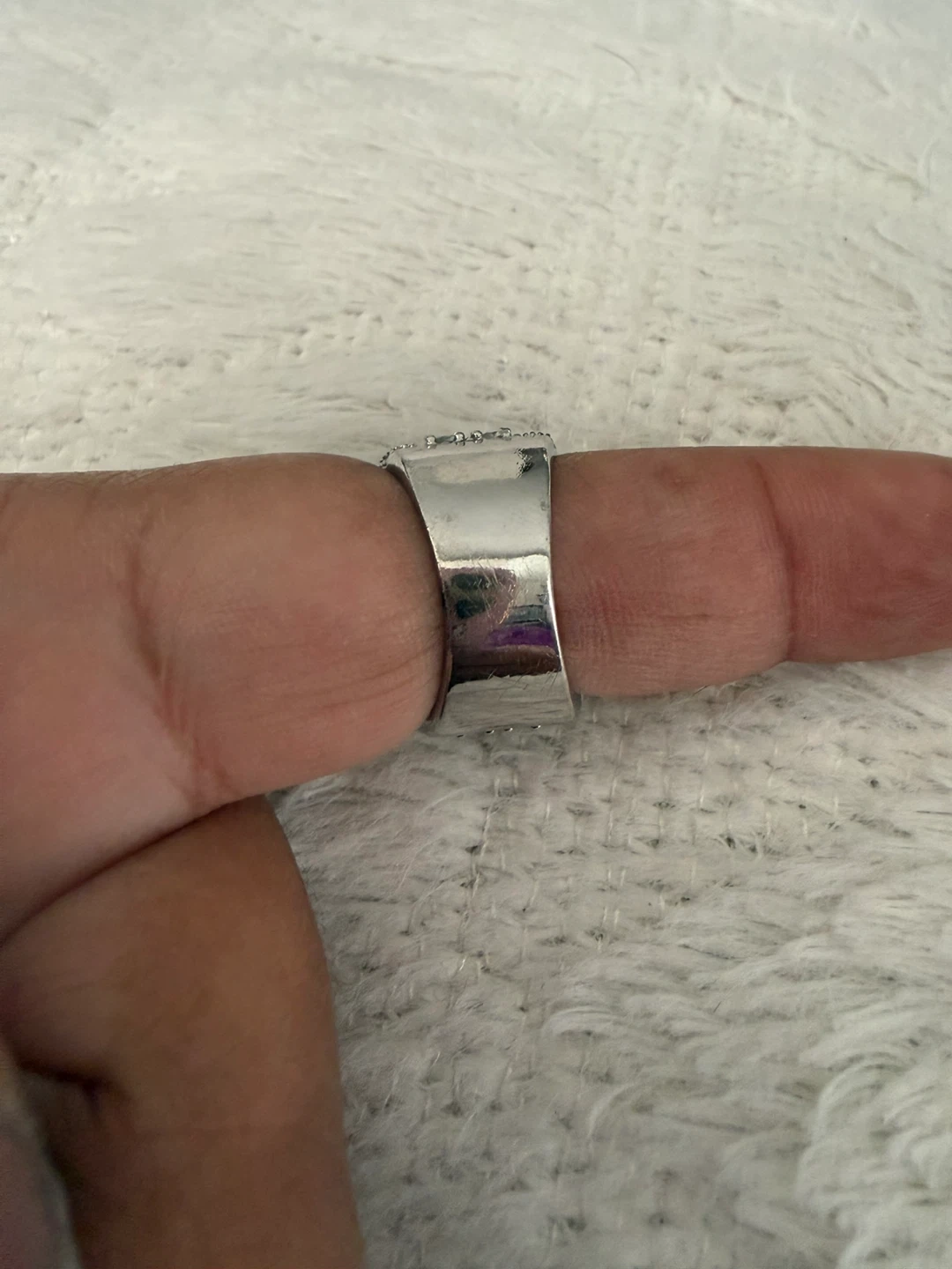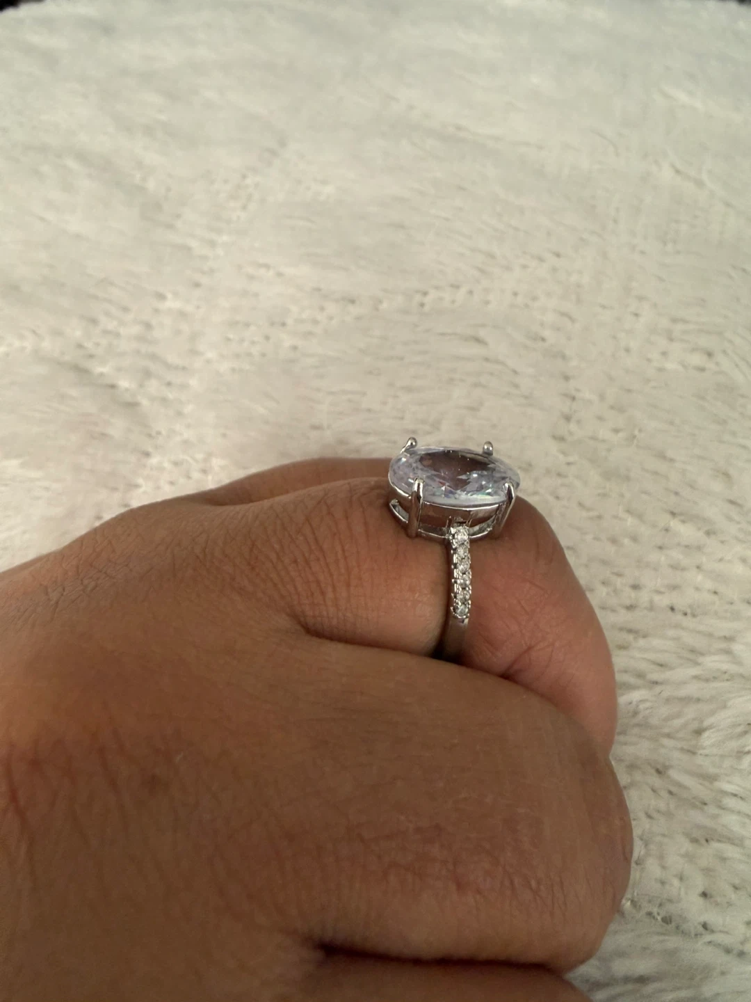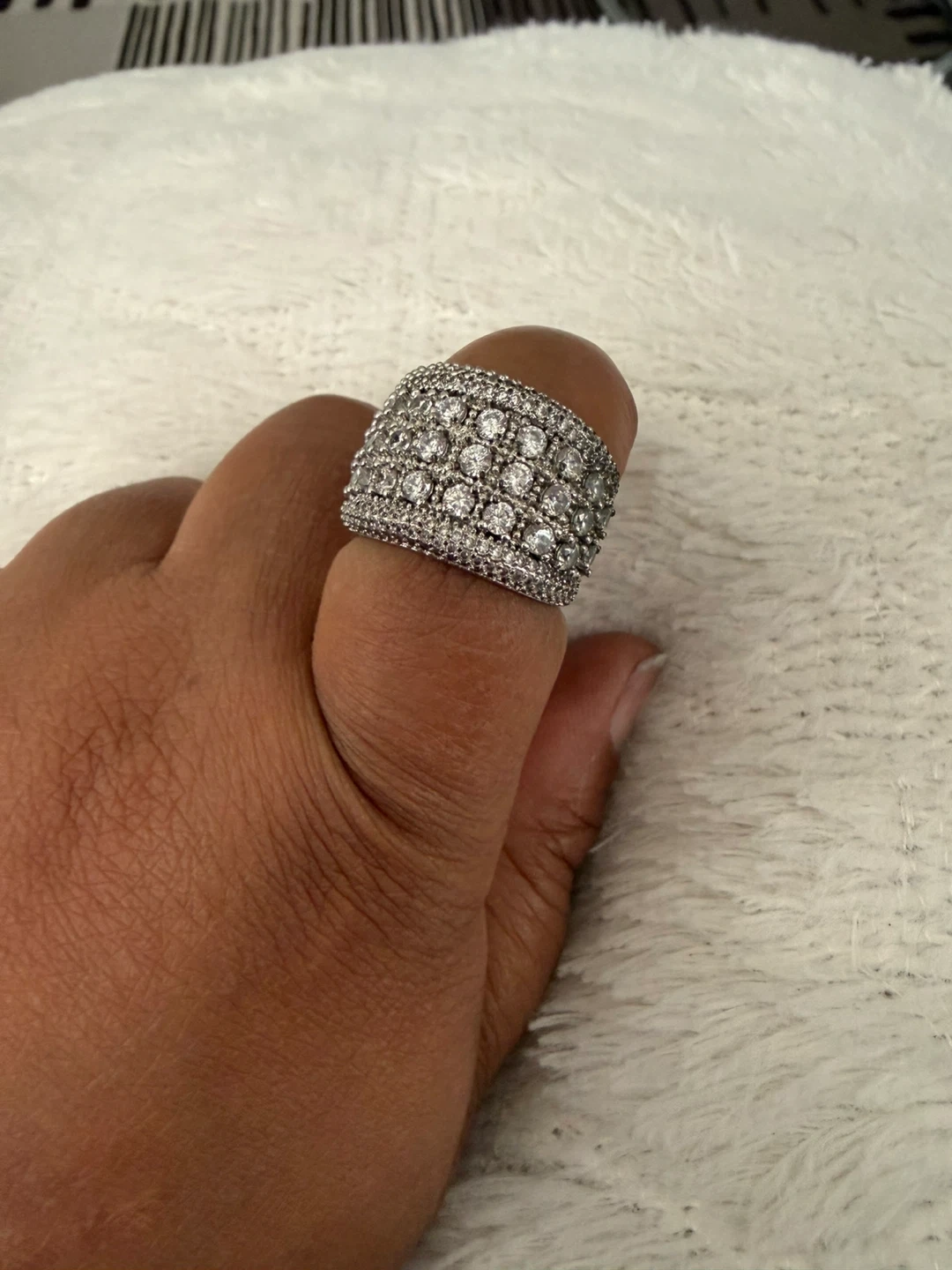 This set includes a large oval-cut centre stone ring with pave detailing on the band, and a wide band ring covered in small stones. Both rings are silver-toned metal with clear, sparkly stones.