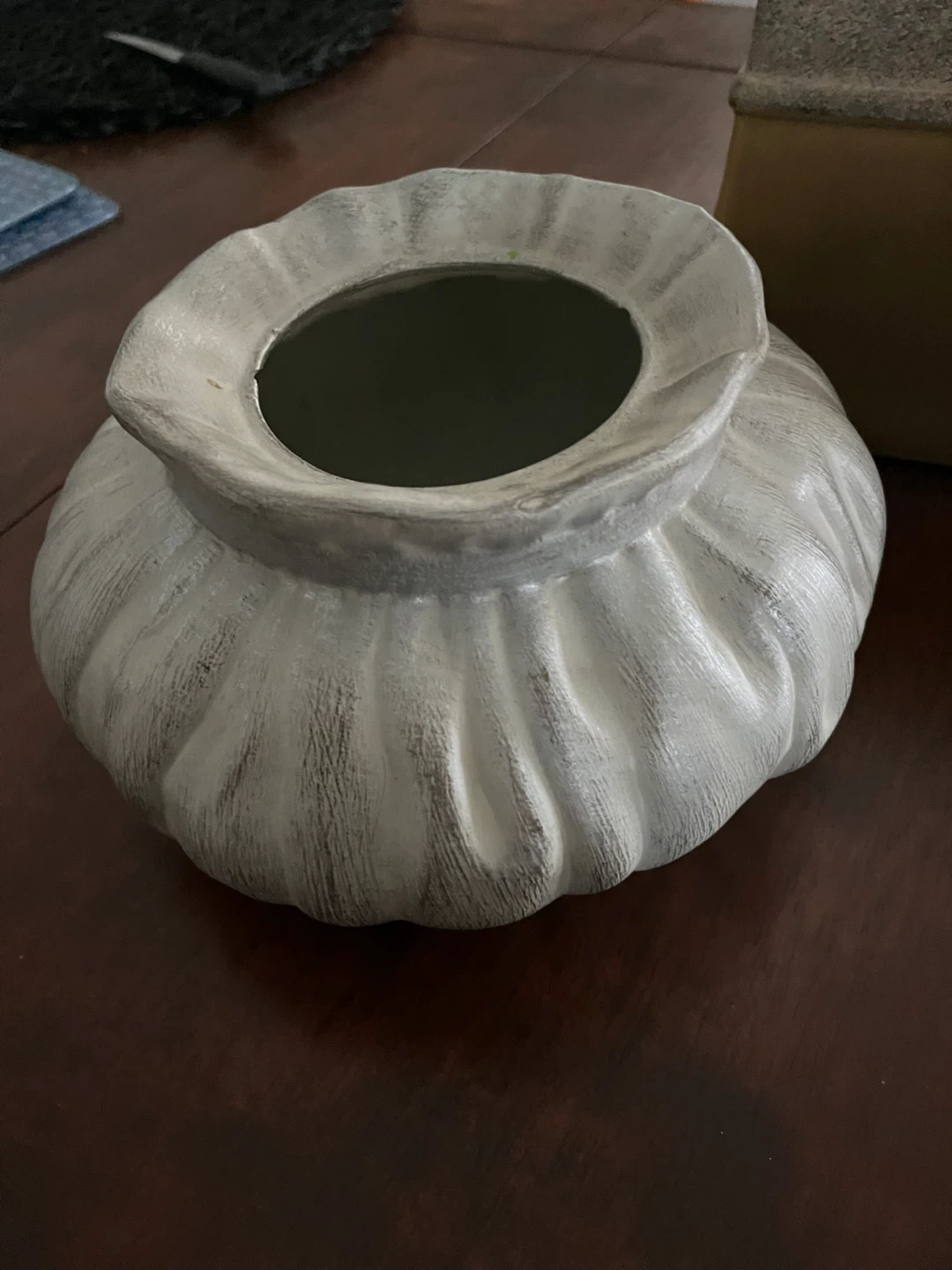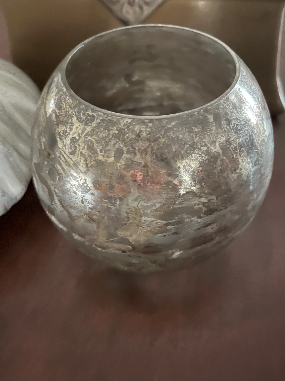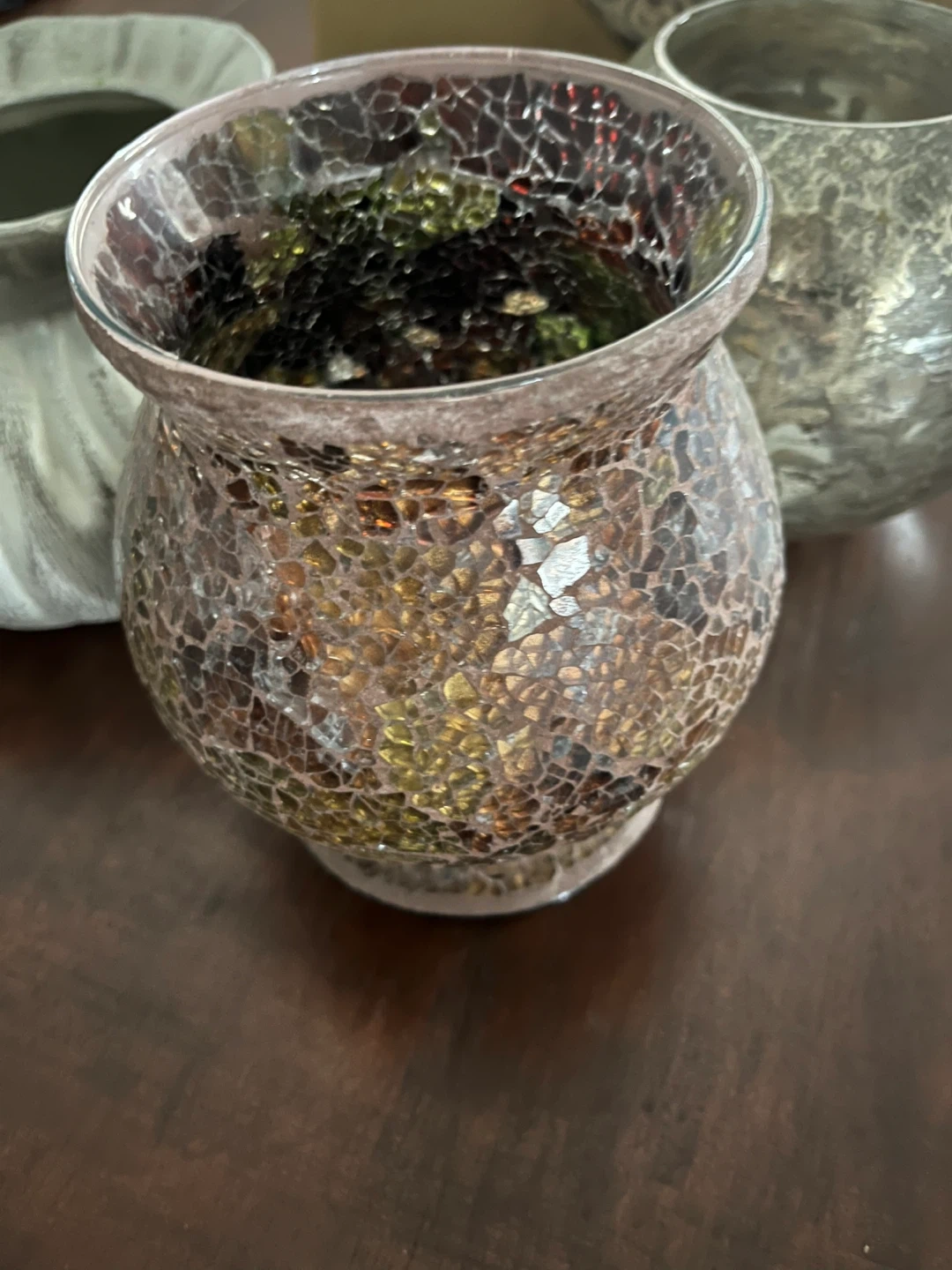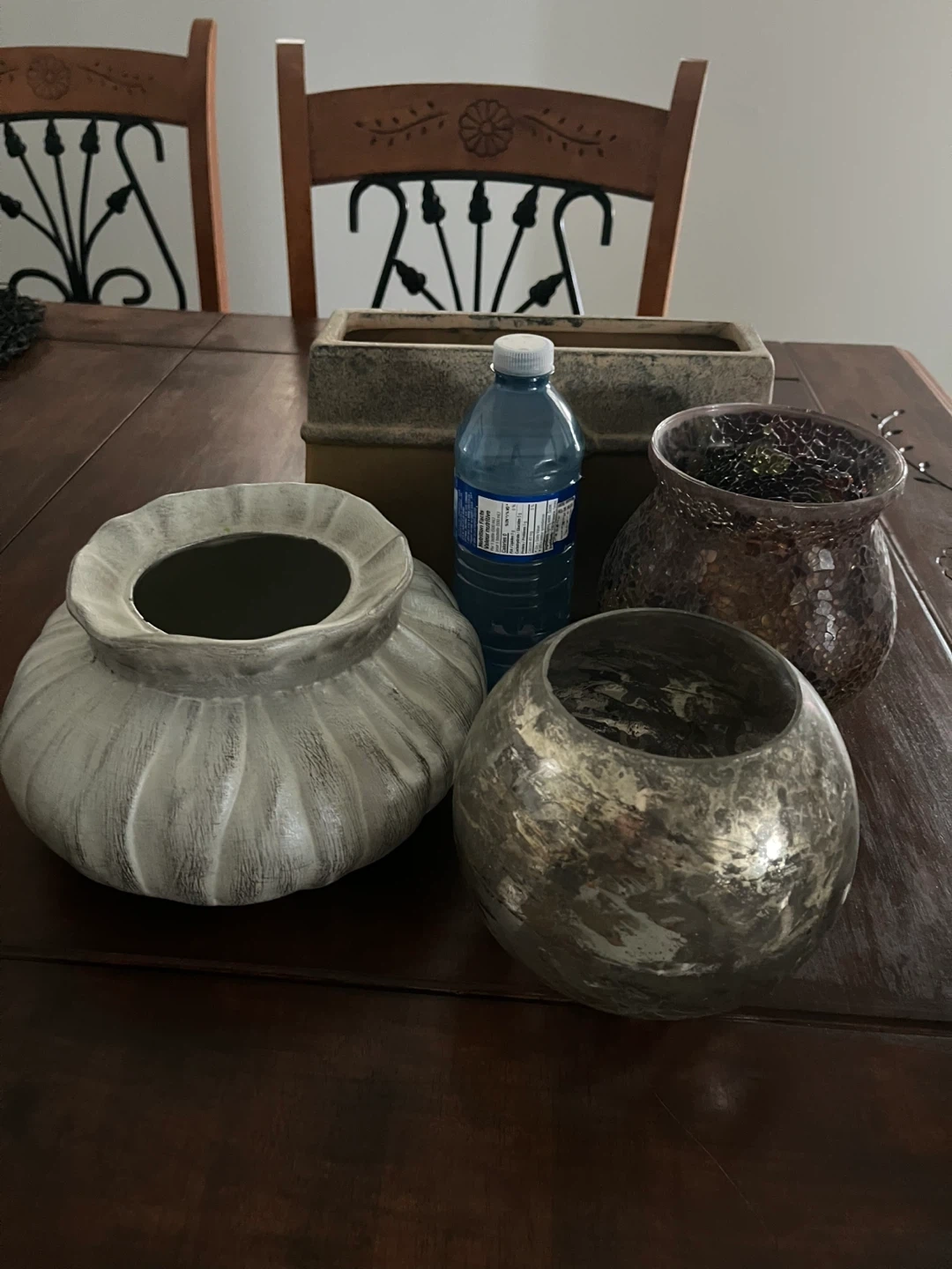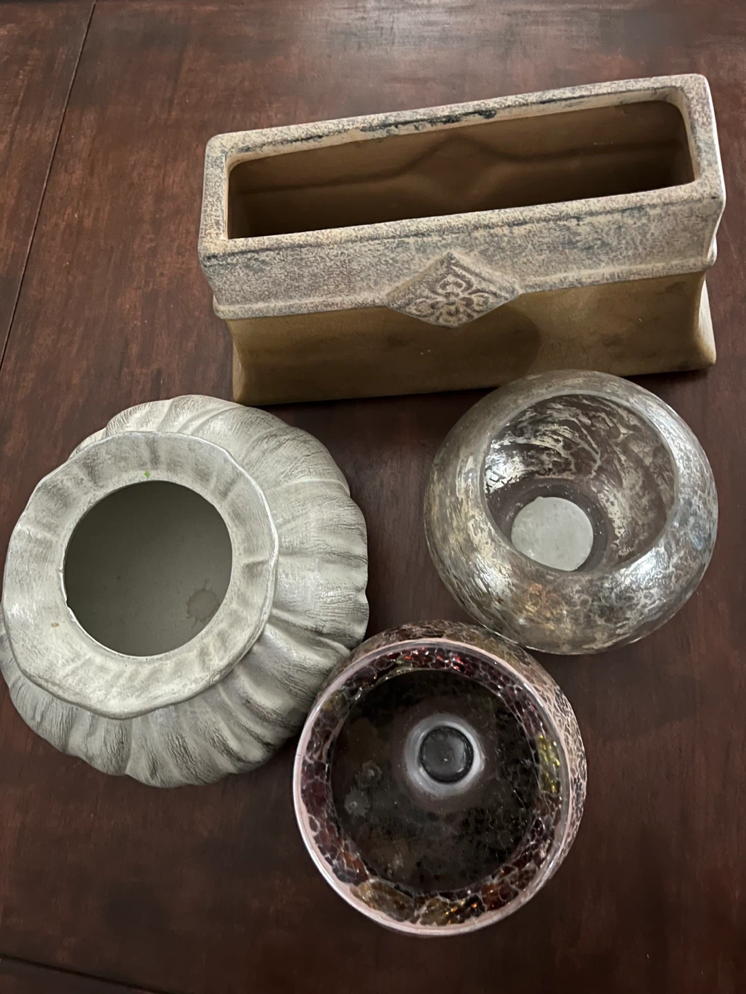 A set of decorative ceramic and glass vases and a planter. Includes a grey ribbed vase, a textured silver spherical vase, a brown and tan rectangular planter with ornate detailing, and a small mosaic-style vase. These pieces add a touch of style to any home decor. Great for holding flowers or as standalone decorative accents!