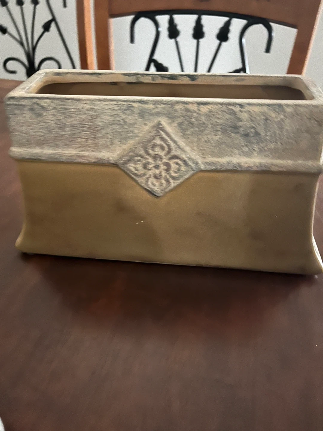A set of decorative ceramic and glass vases and a planter. Includes a grey ribbed vase, a textured silver spherical vase, a brown and tan rectangular planter with ornate detailing, and a small mosaic-style vase. These pieces add a touch of style to any home decor. Great for holding flowers or as standalone decorative accents!