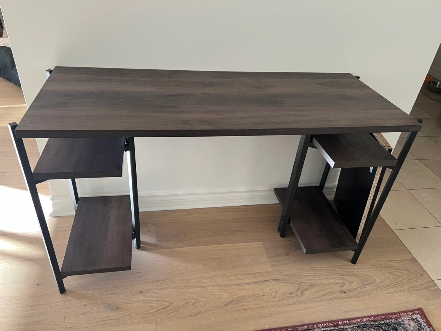 Dark brown wood desk with black metal frame and 3 shelves. Bought at Home Depot for $100