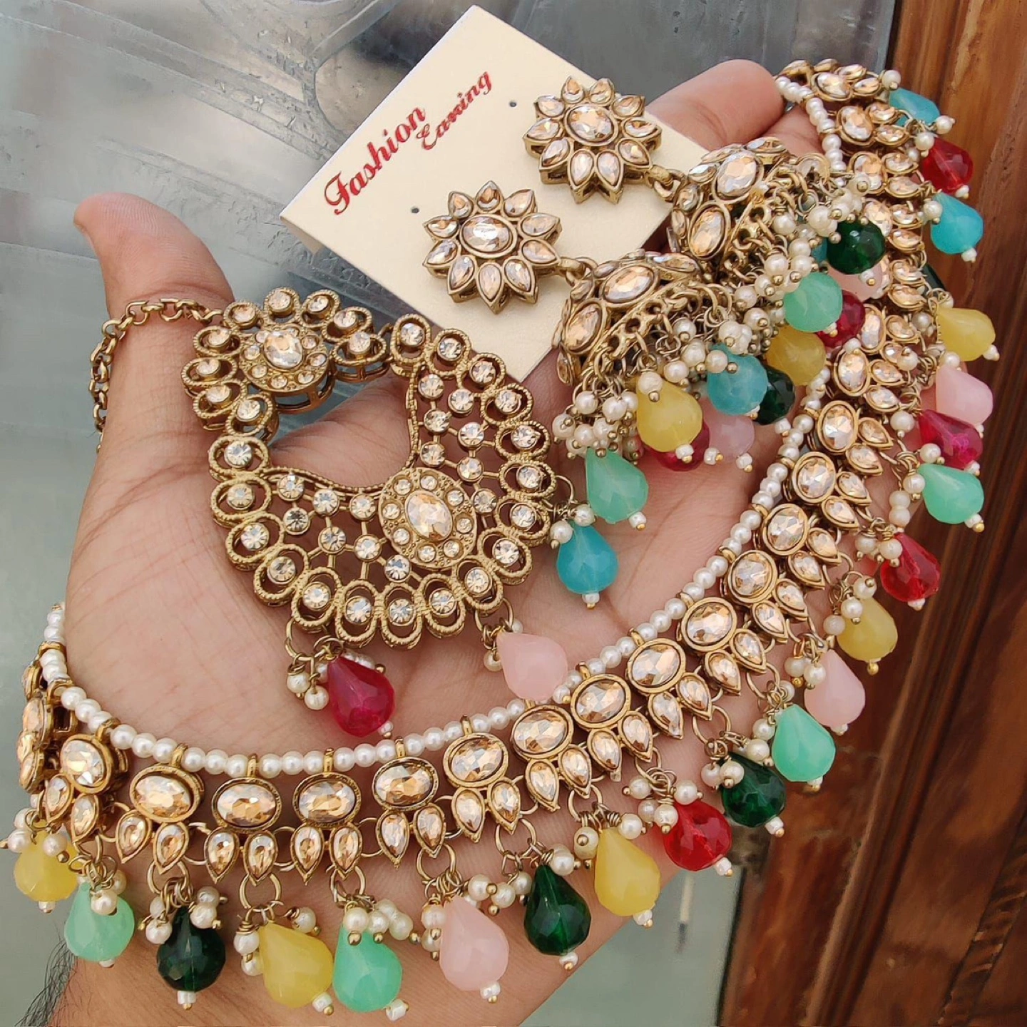 A beautiful necklace and earring set. The necklace features colourful beads and imitation jewels. The earrings match the necklace in design and stones. It would be perfect for a special occasion.